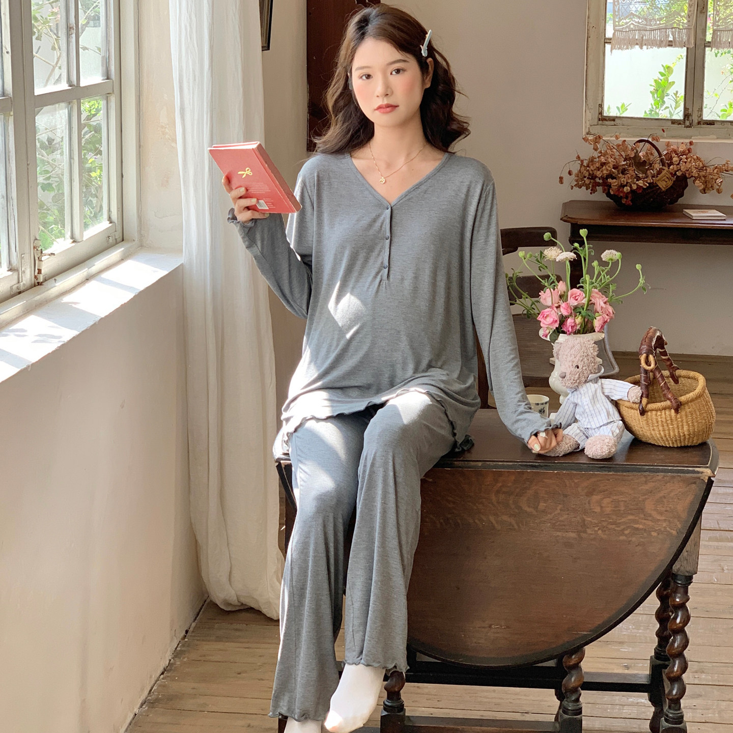 四季 产前产后喂奶莫代尔月子服哺乳 家居服套装 歌美姿孕妇睡衣长袖