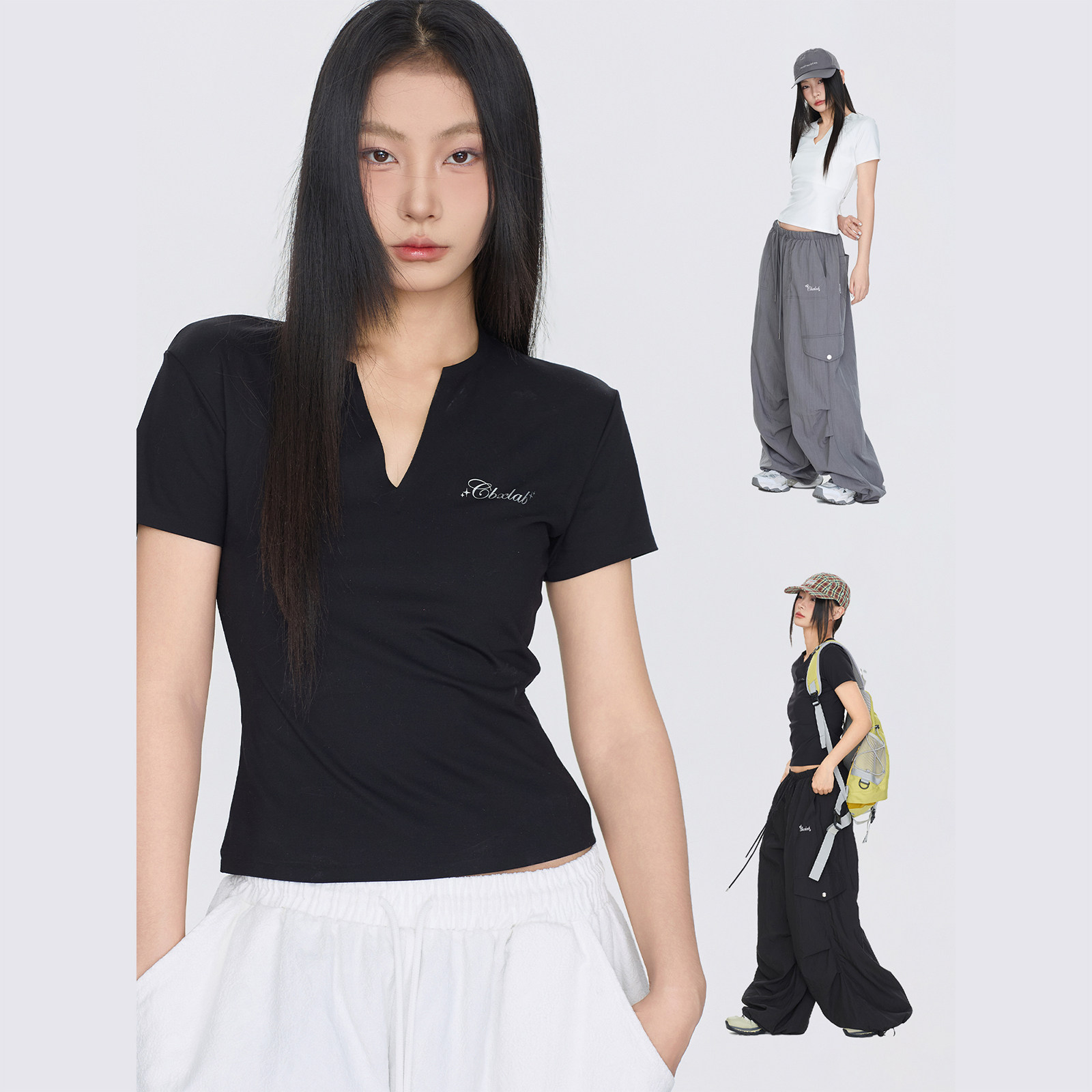 CBXLAB街舞潮牌V领高弹辣妹春夏透气抑菌短袖 高街上衣女 性感修身