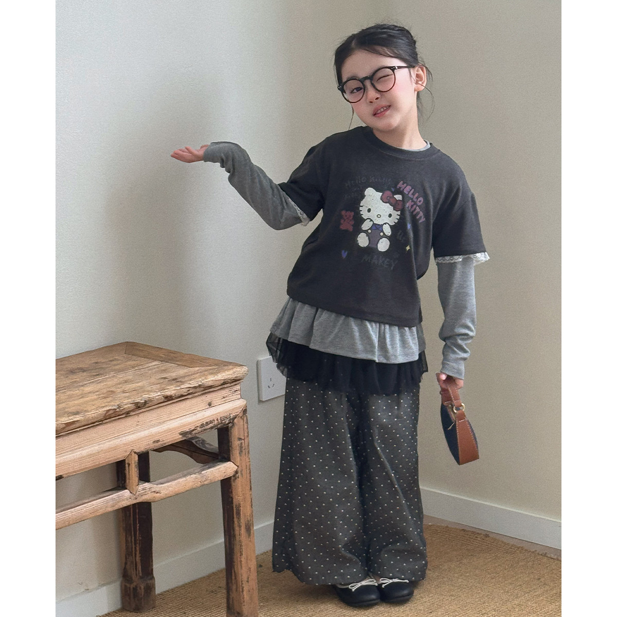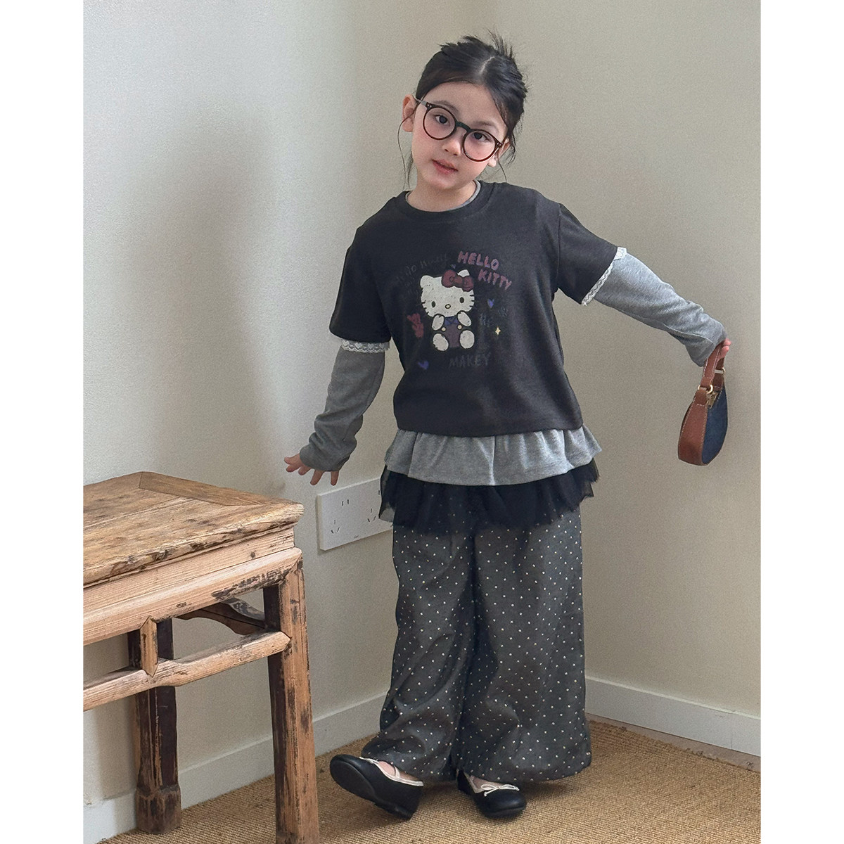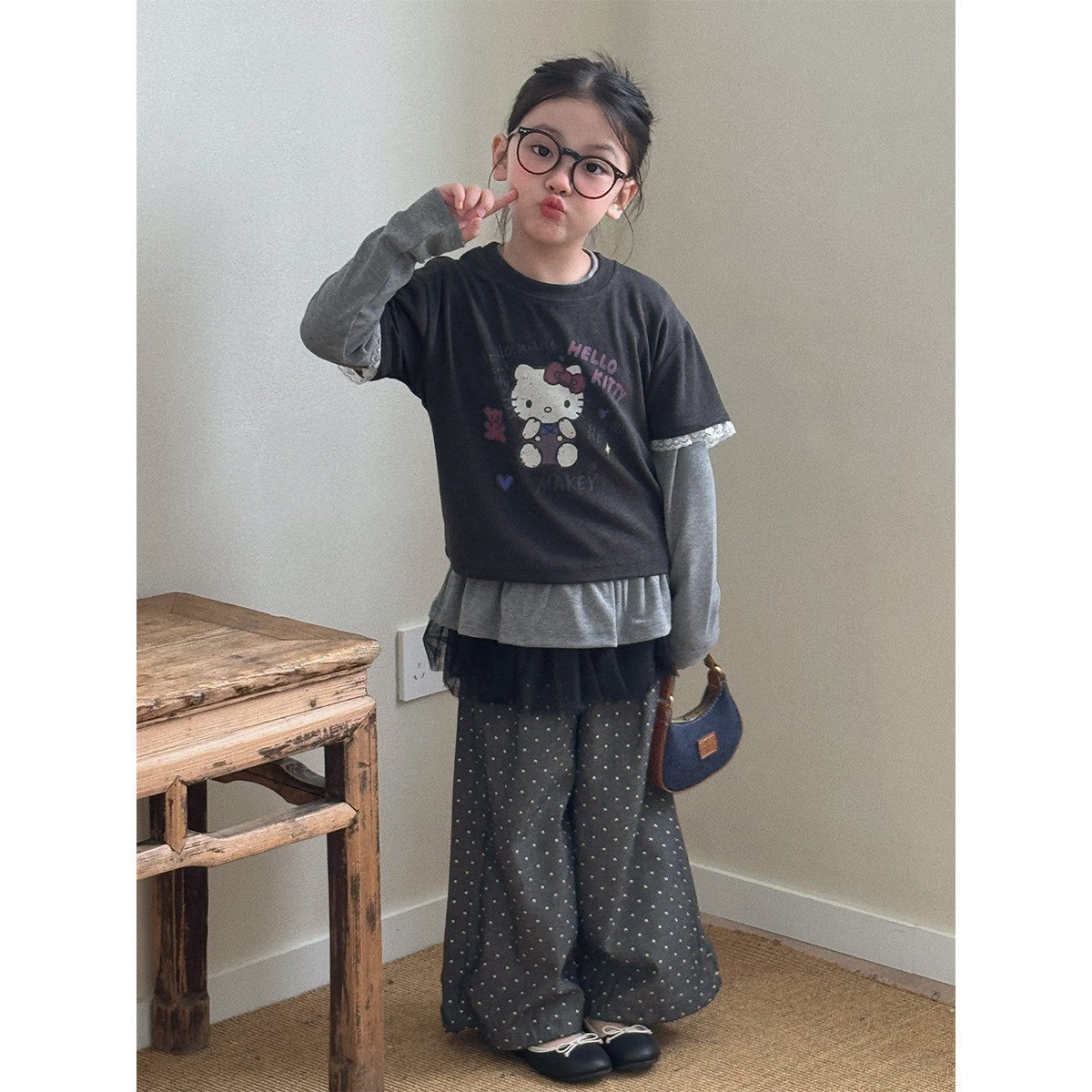 洋气韩版 新款 春季 潮 网纱屁帘裤 套装 卡通打底衫 女童真两件T恤套装