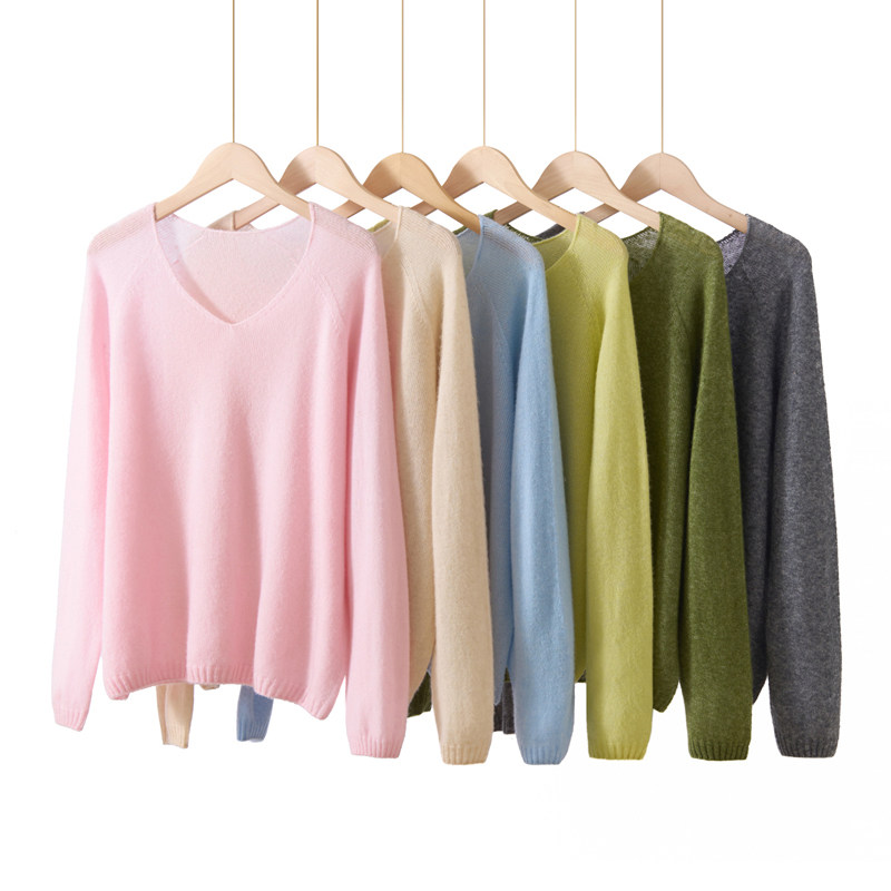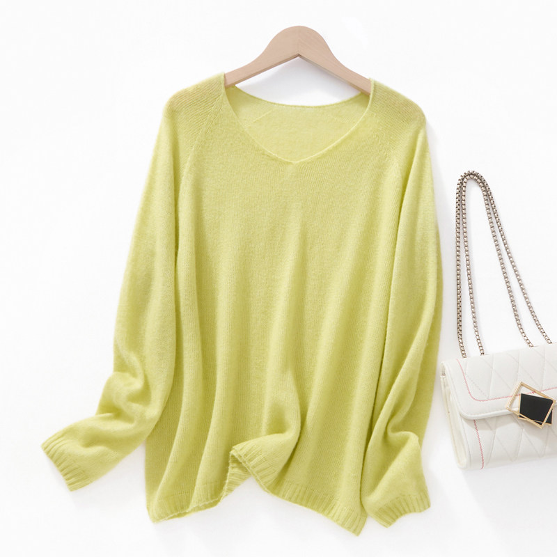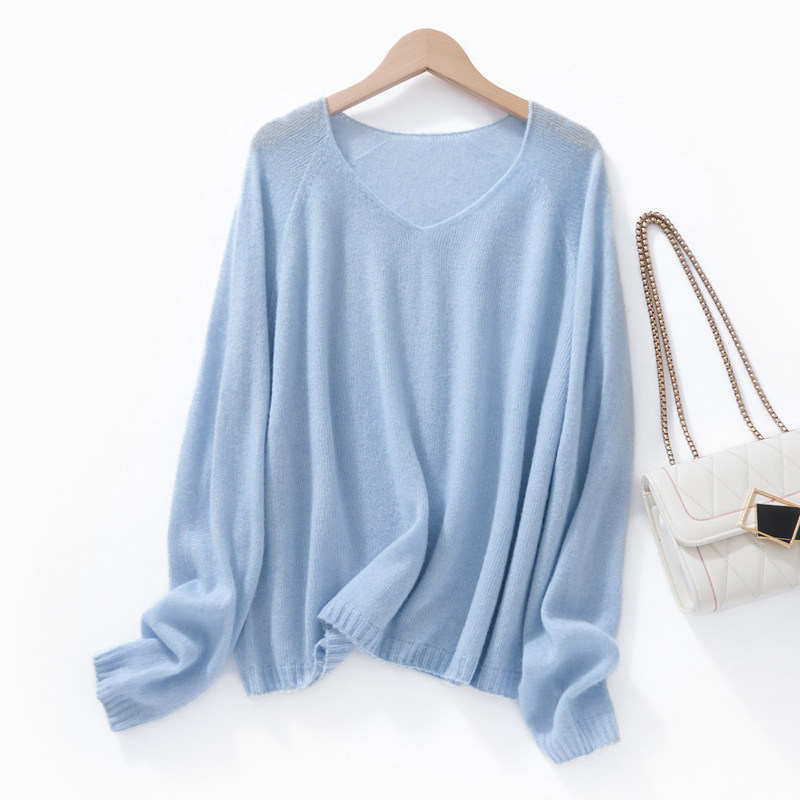 女慵懒风软糯百搭上衣 桑蚕丝山羊绒毛衣薄V领糖果纯色系针织罩衫