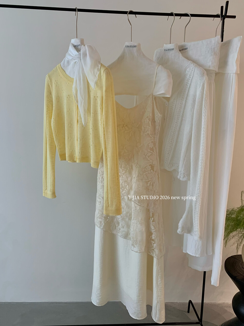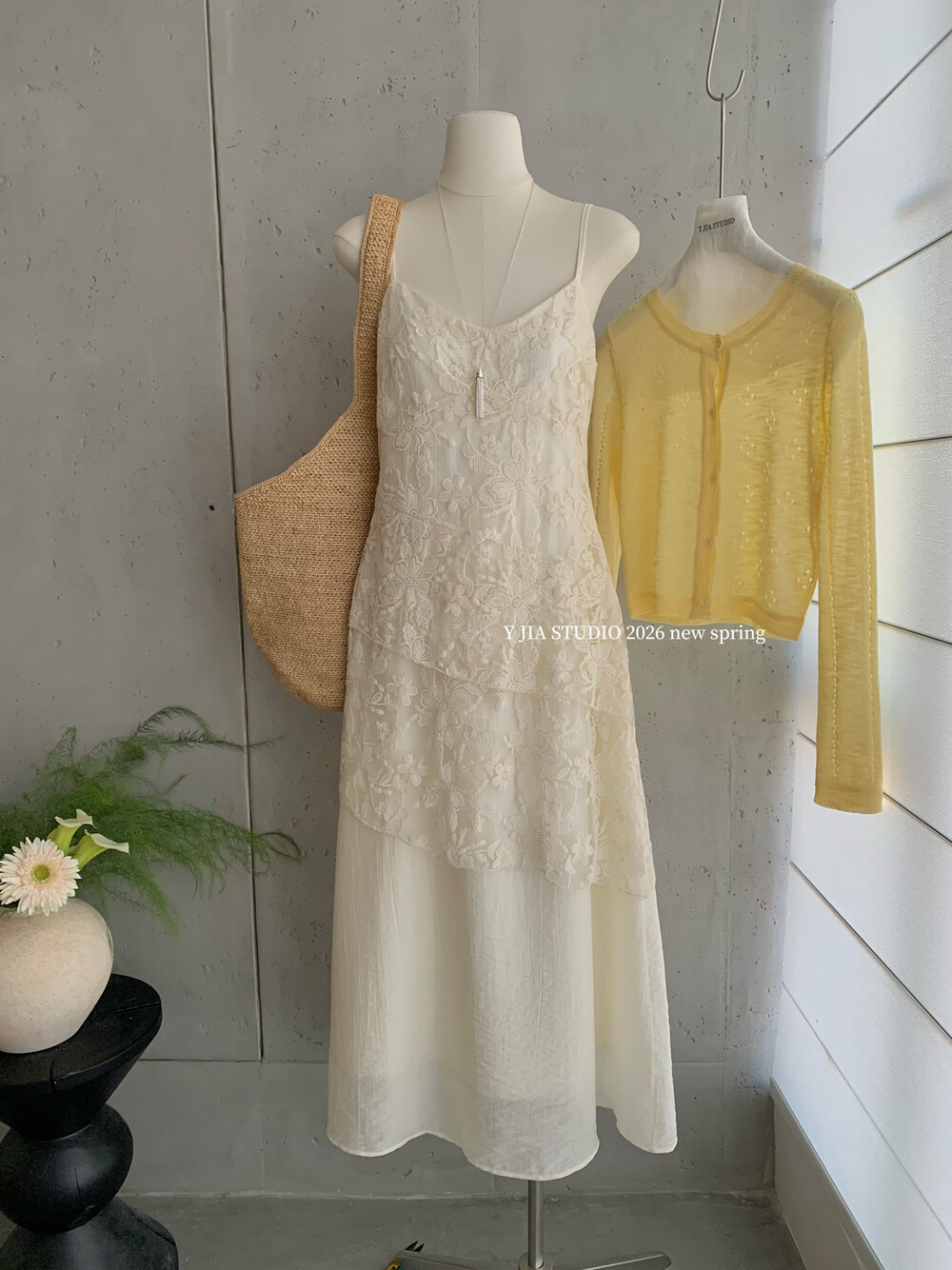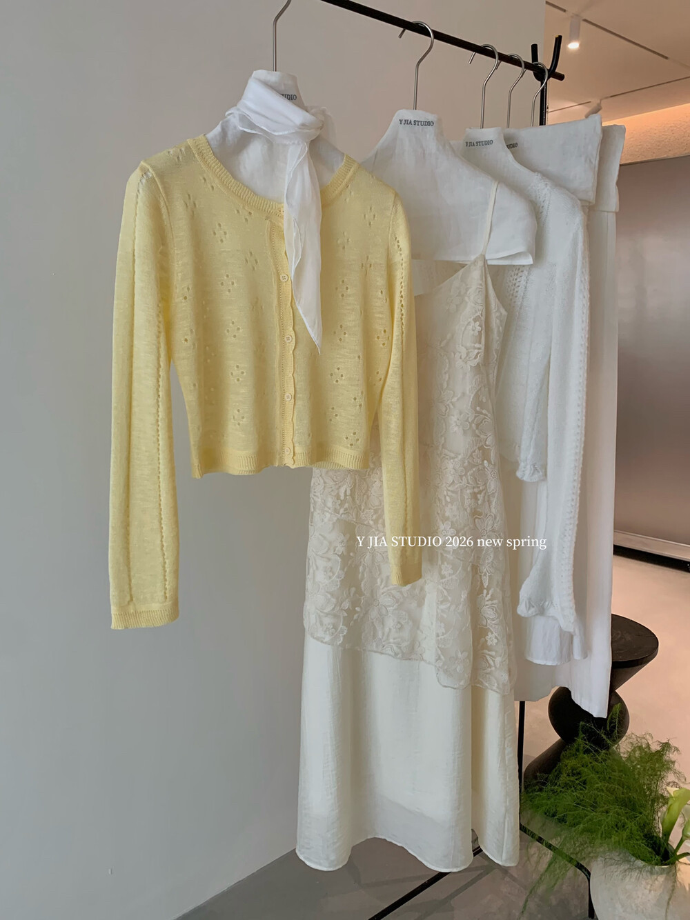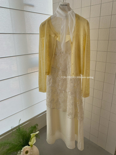 Y.JIA 镂空设计感针织开衫 套装 伊嘉温柔风气质V领蕾丝吊带连衣裙由