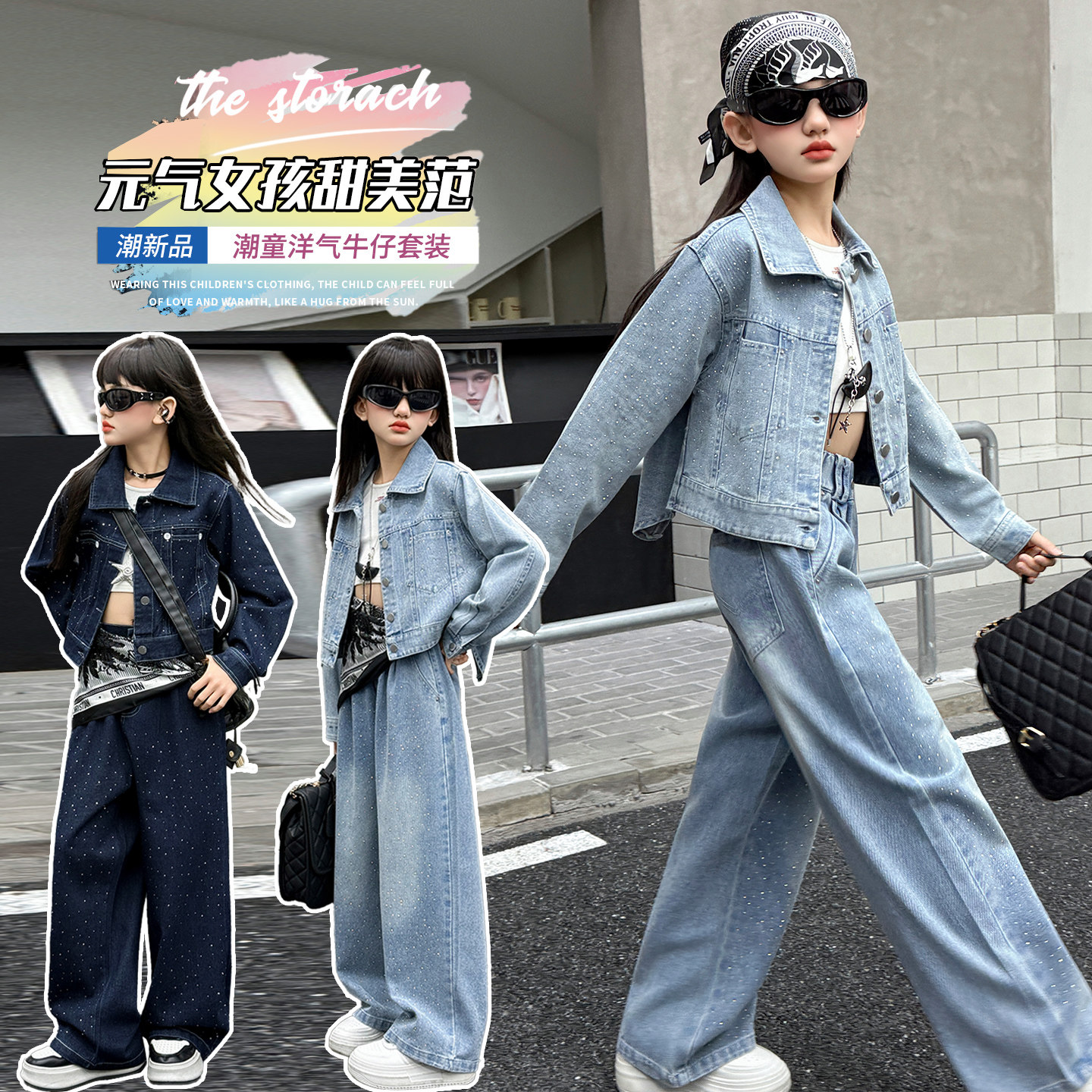 女童烫钻牛仔套装 春秋装 洋气时髦中大童牛仔外套两件套装 2026新款