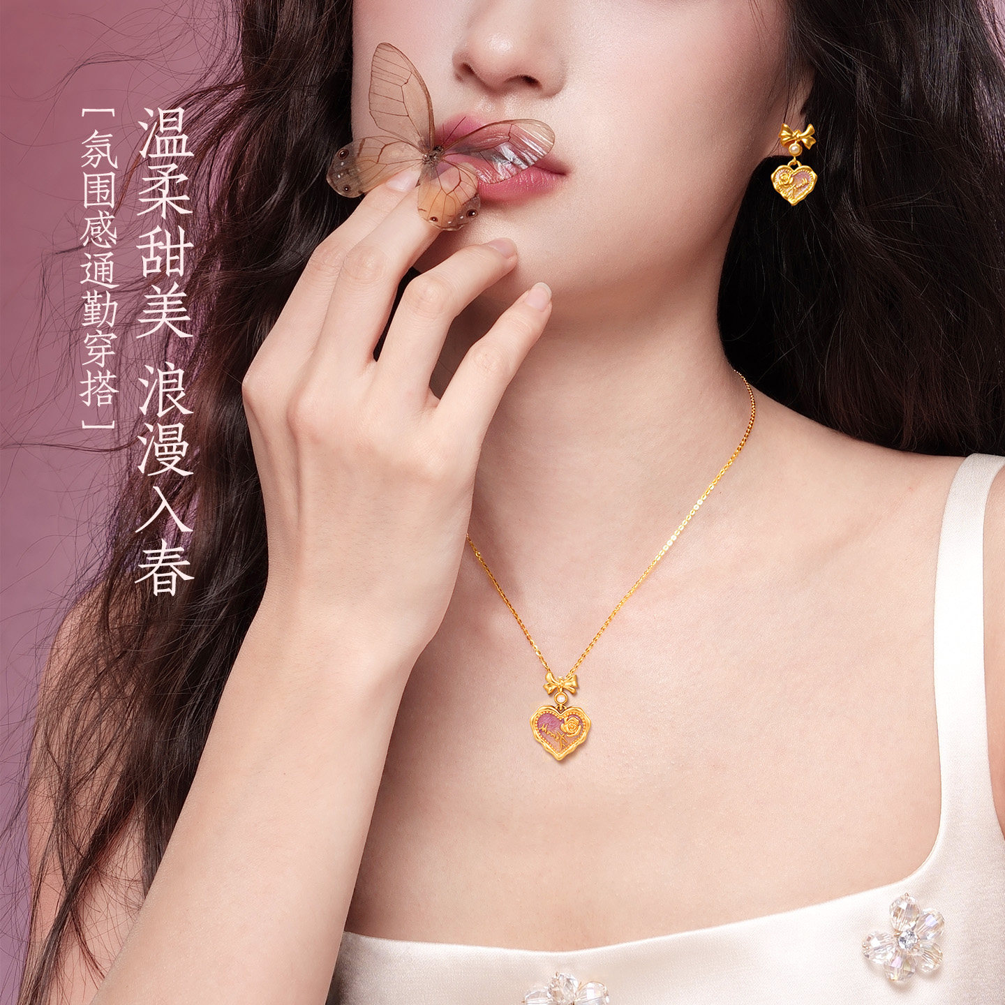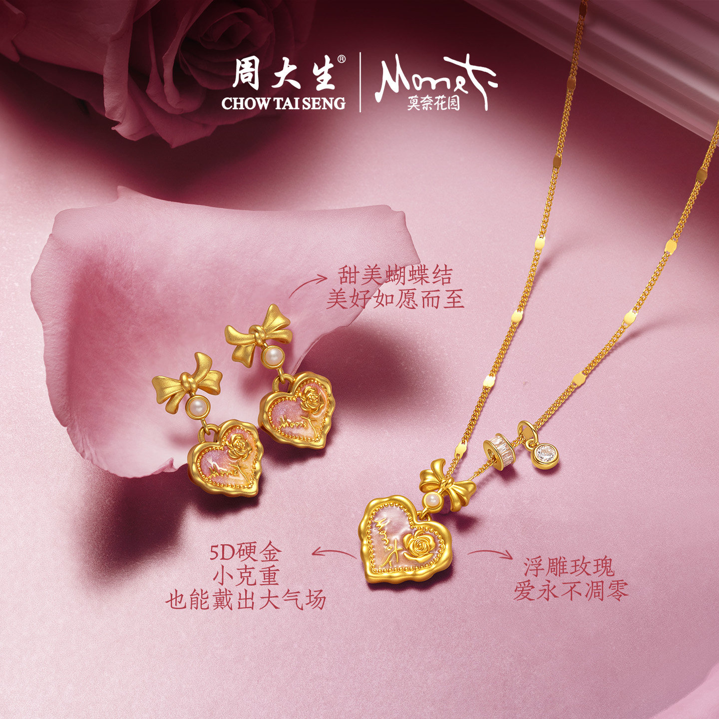 周大生黄金项链吊坠爱心玫瑰莫奈荧光珐琅足金挂坠女生生日礼物