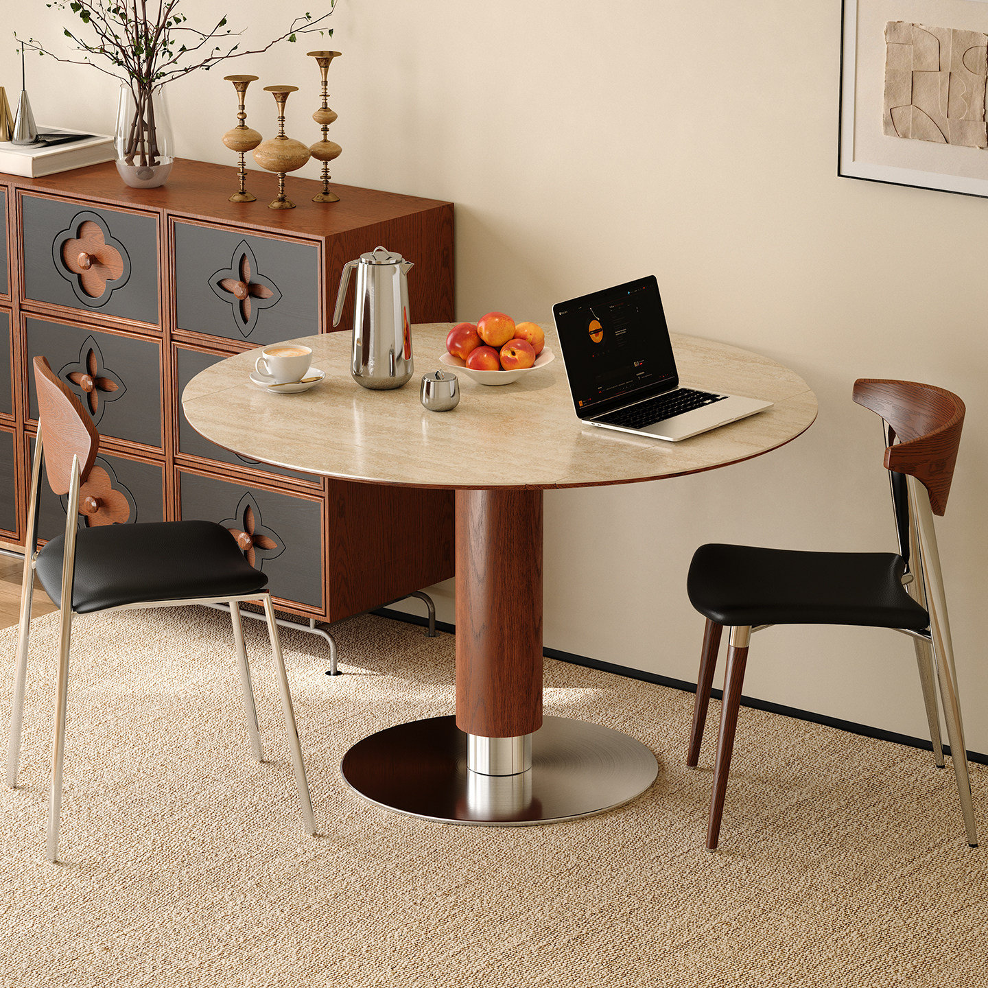 木小咖中古风家用小户型省空间可变圆桌可折叠洞石岩板餐桌椅组合由