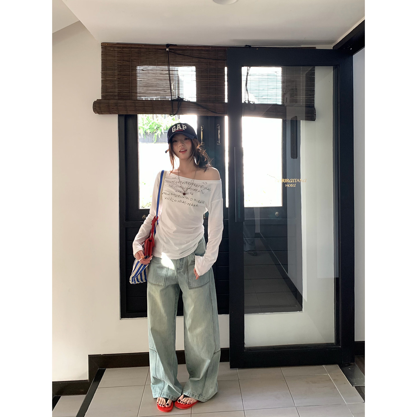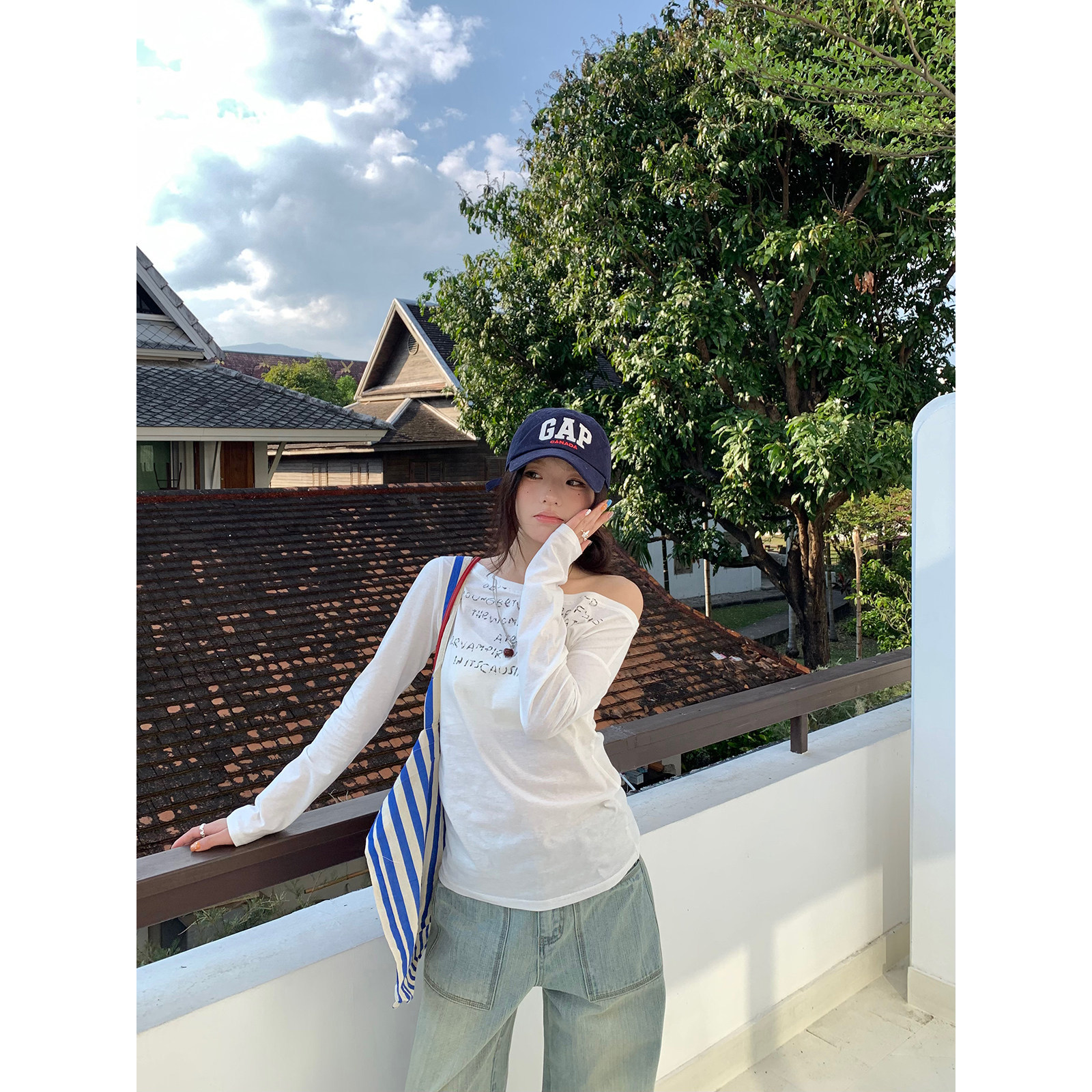T2026春夏新款 小众露肩设计套头字母上衣女 斜肩印花长袖 荒荒家