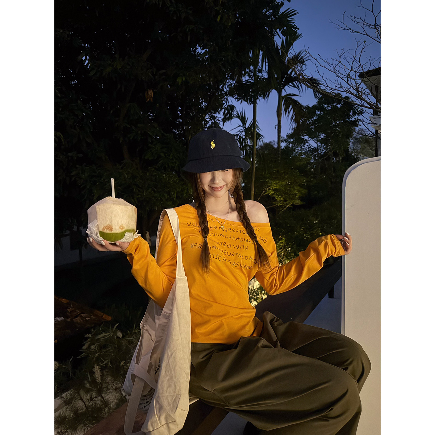 T2026春夏新款 小众露肩设计套头字母上衣女 斜肩印花长袖 荒荒家由