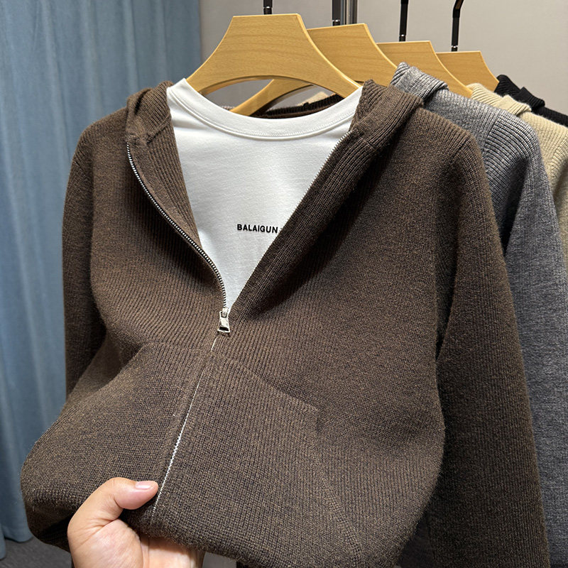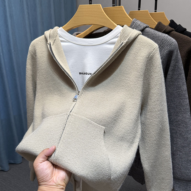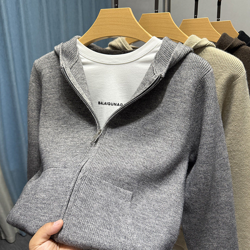 时尚 连帽双拉链软糯长袖 针织开衫 毛衣外套女春季 休闲上衣 气质帽衫