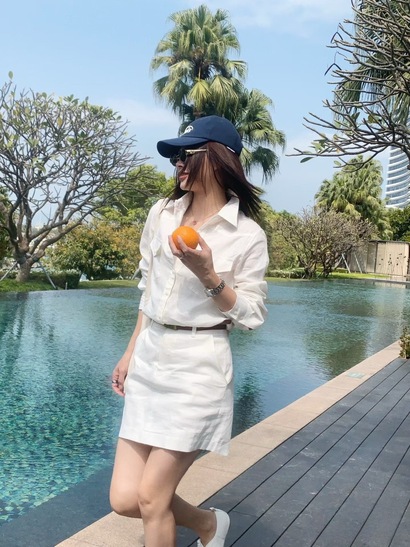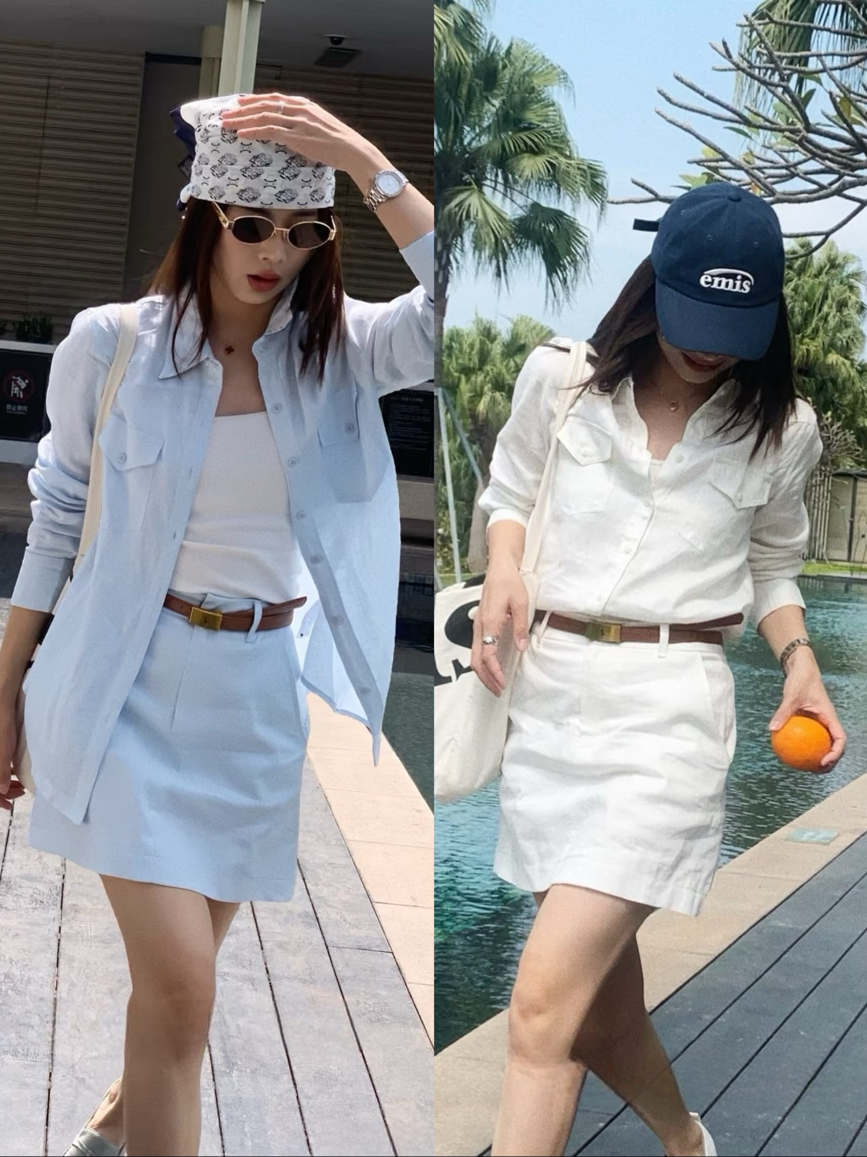 100%亚麻裤 蓝色衬衫 春夏韩系洋气减龄长袖 衬衣短裙两件套 裙套装由