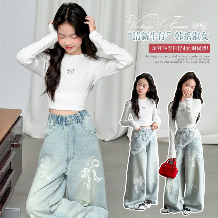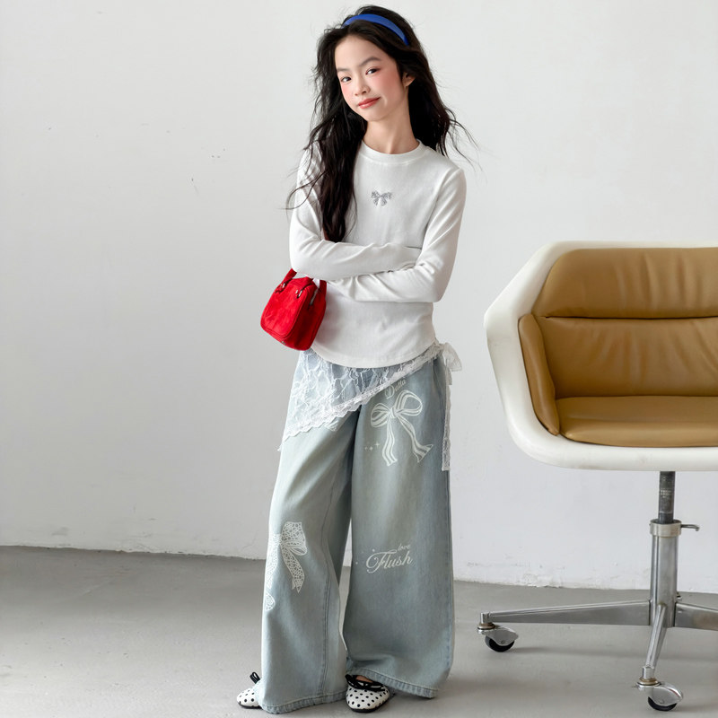 甜美风女童两件套春秋蝴蝶结上衣蕾丝屁帘牛仔裤 洋气套装