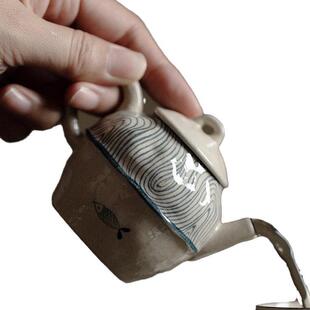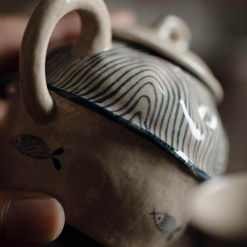 梵汝青花釉下彩海浪鱼纯手绘布里壶高档把玩陶瓷茶具手执壶泡茶壶
