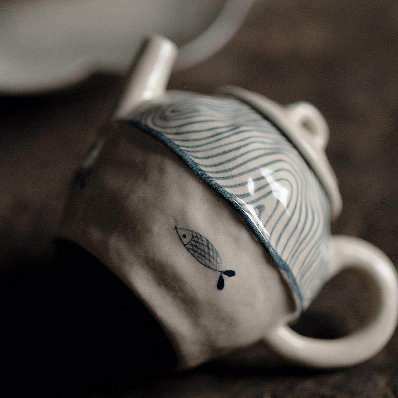 梵汝青花釉下彩海浪鱼纯手绘布里壶高档把玩陶瓷茶具手执壶泡茶壶由