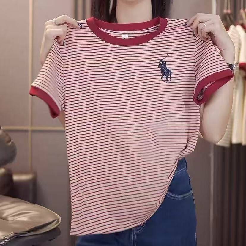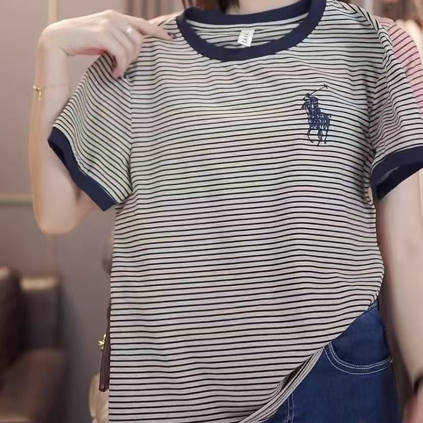 经典 拼接条纹圆领清新T恤女士夏季 气质简约绣花短袖 小衫 上衣 韩版