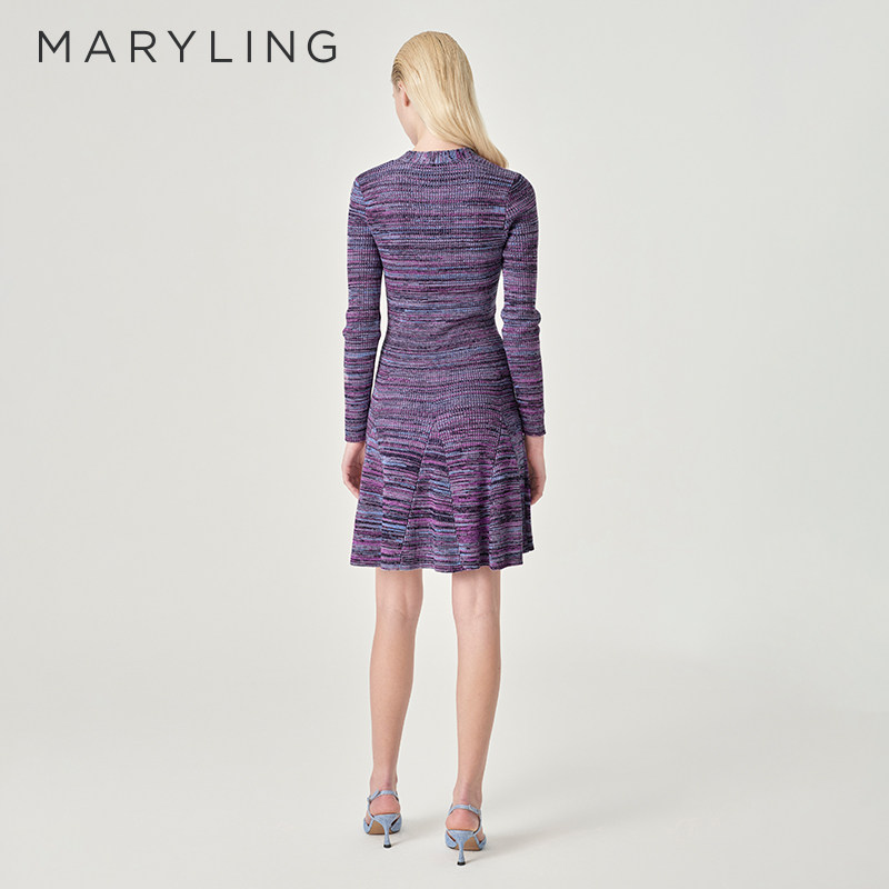 香芋紫V领混色针织连衣裙A1EAW04660 MARYLING玛俪琳初春新品