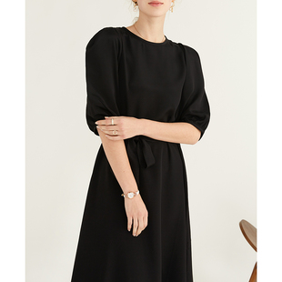 一丝牵 夏 重绉35姆米真丝连衣裙100%桑蚕丝黑色优雅中长裙泡泡袖