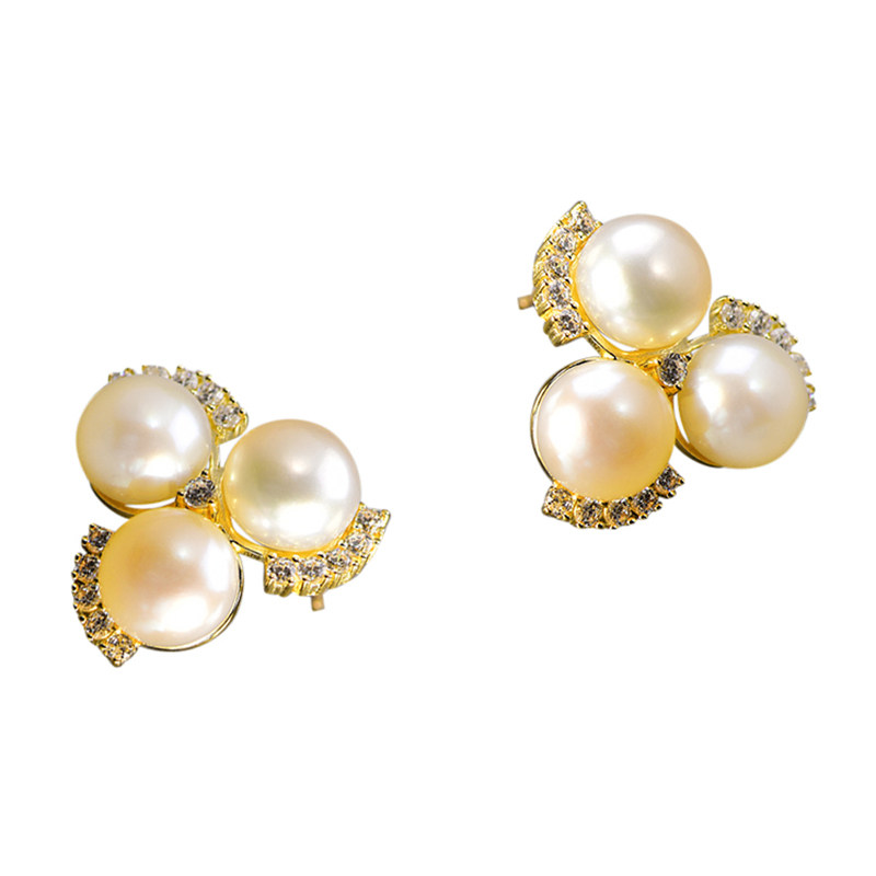 时尚 三角设计镶钻珍珠彩金耳饰潮 个性 韩国流行10K黄金耳钉女
