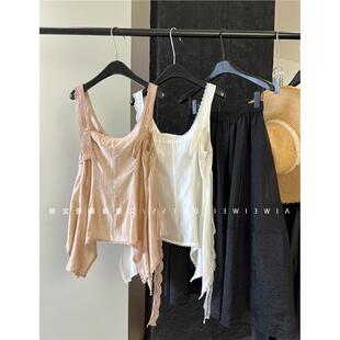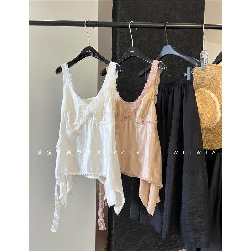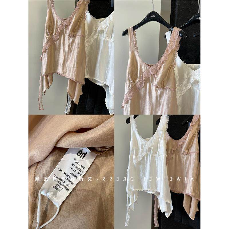 桑蚕丝 天丝重工蕾丝不规则飘带下摆V领吊带背心女 巨炸裂 牛X货由