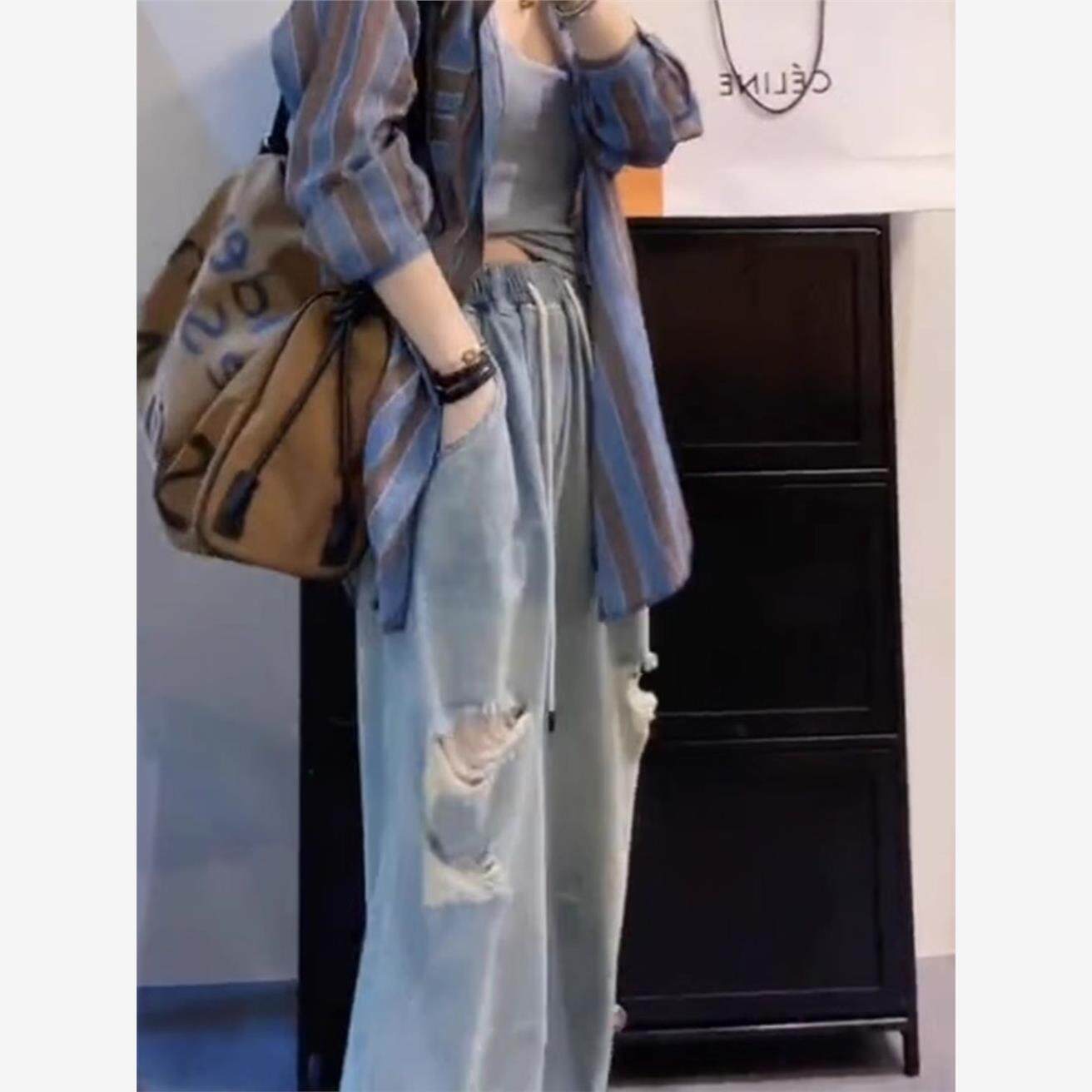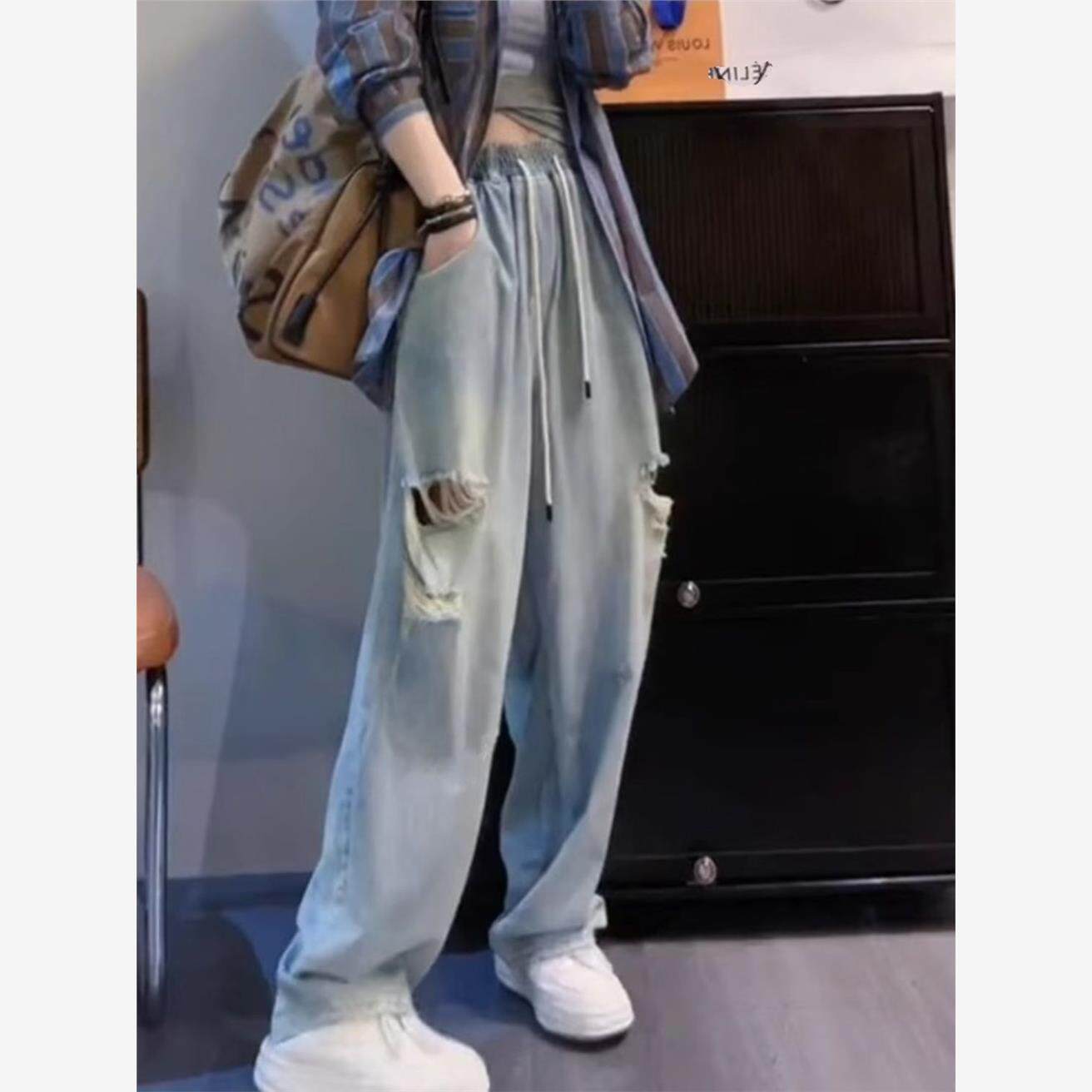 破洞松紧腰牛仔裤 长裤 子阔腿宽松高腰拖地显瘦学生韩版 休闲 女夏季