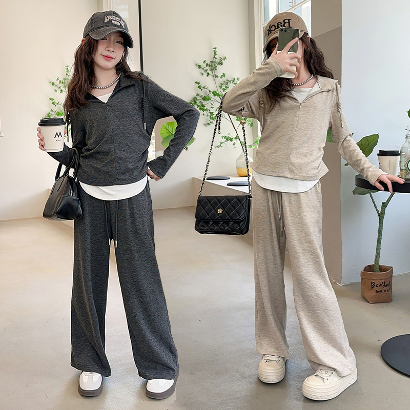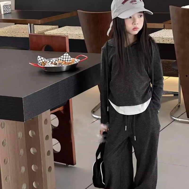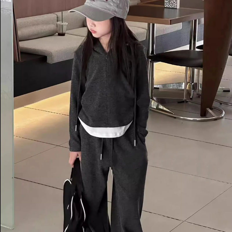 春秋新款 韩版 女童洋气假两件连帽长袖 上衣套装 两件套潮 糯米直筒裤