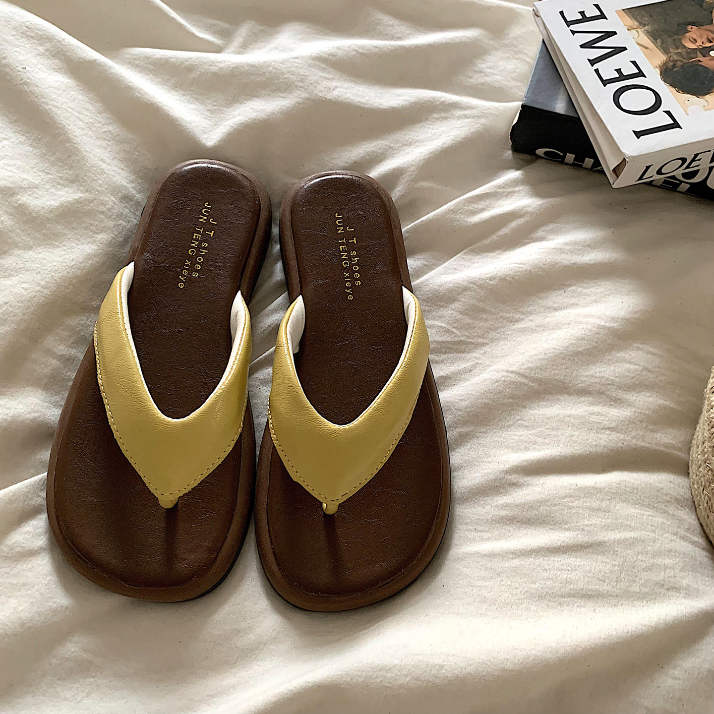 厚底坡跟人字拖女夏外穿高级感复古拼色沙滩度假夹脚凉拖 细细条