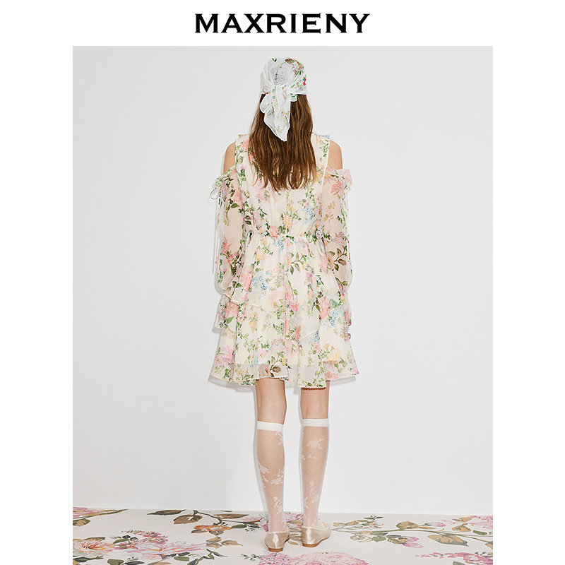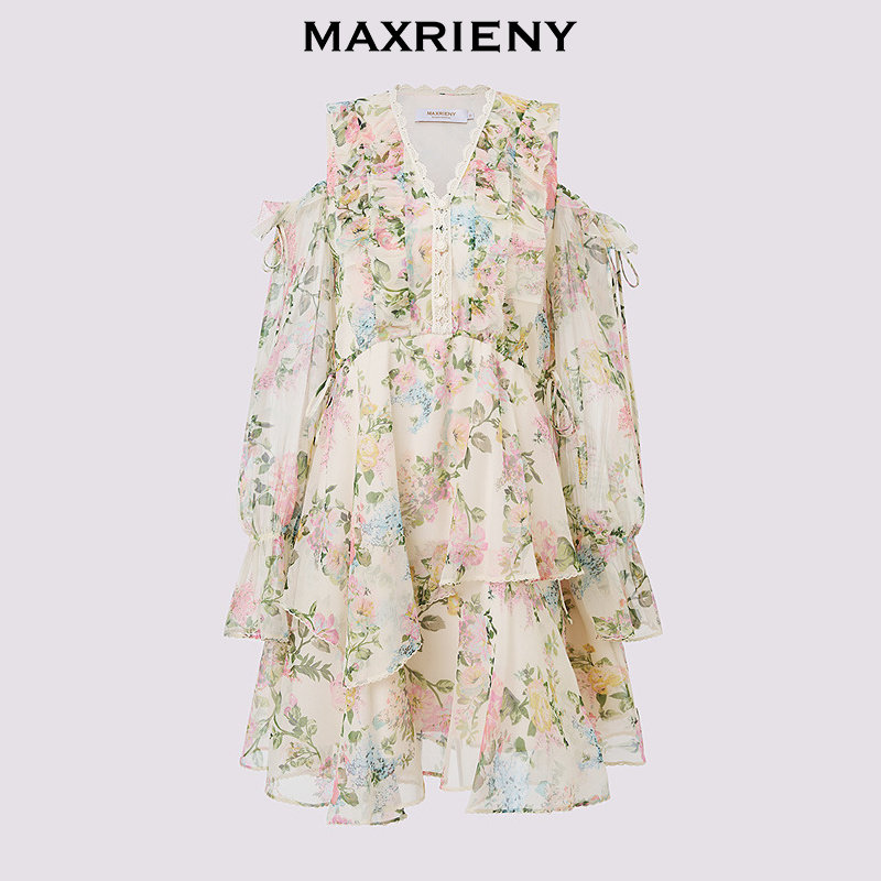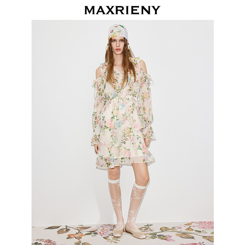 MAXRIENY露肩印花连衣裙2026春季 新款 V领荷叶边裙子 商场同款