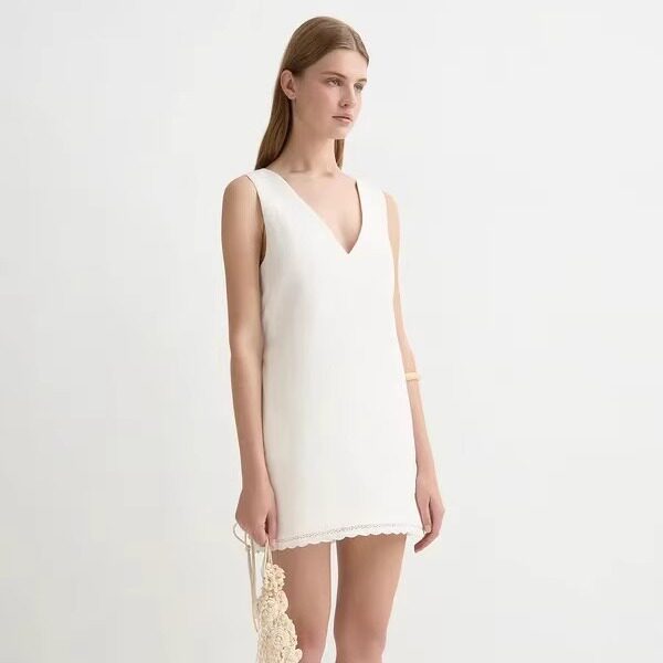 posse同款 老钱风极简a字修身 背心裙无袖 小白裙 v领亚麻连衣裙短款