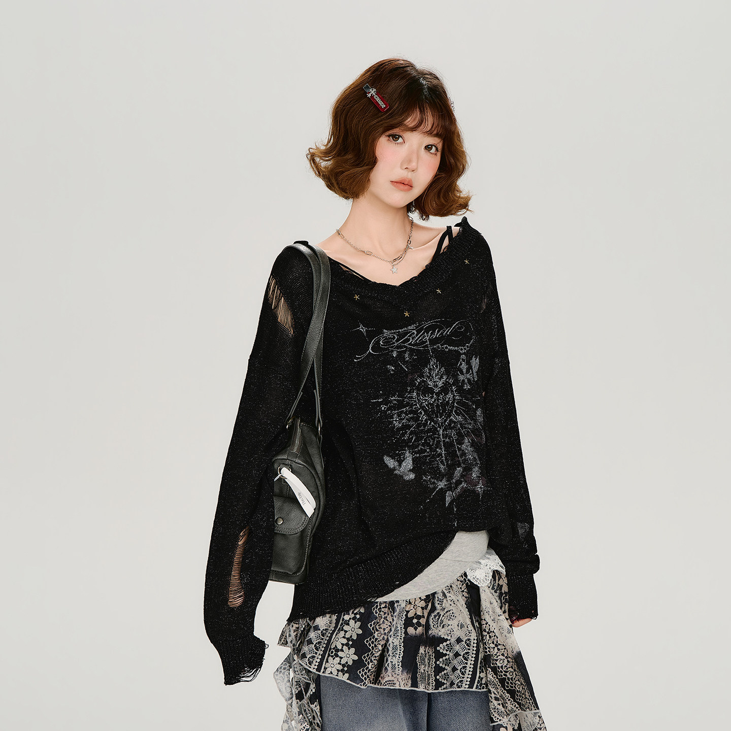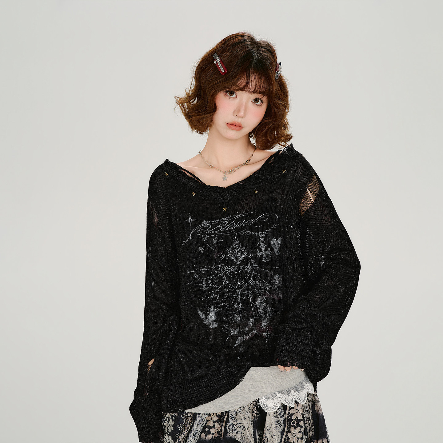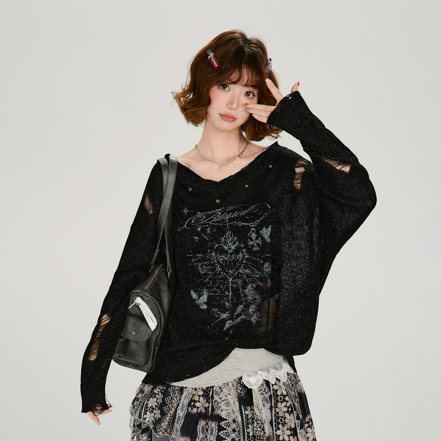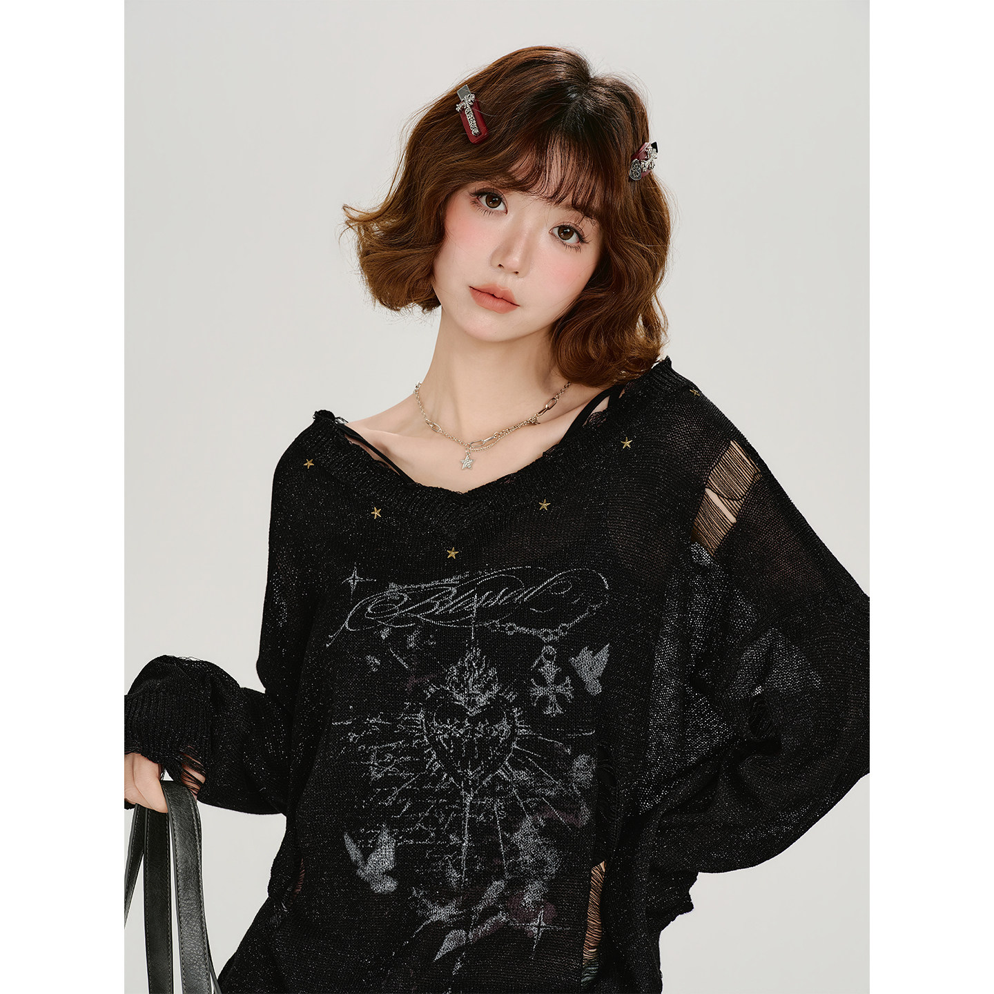 Girlyhalo美式 针织镂空罩衫 女春夏新款 宽松上衣 复古印花v领薄款