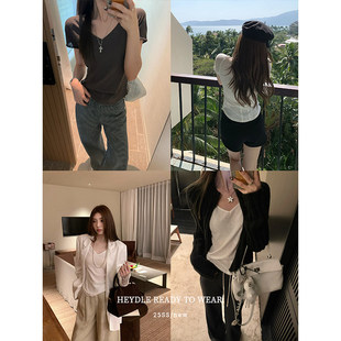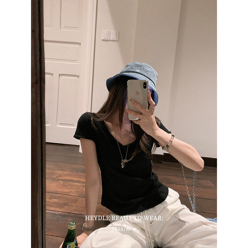 T恤女春夏季 黑豆哼哼 雾隐撩人 V领透感白色短袖 内搭上衣 百搭短款由