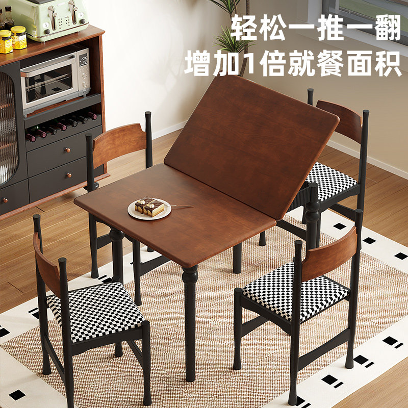 复古可伸缩靠墙省空间实木吃饭桌子 中古风小户型折叠餐桌家用法式