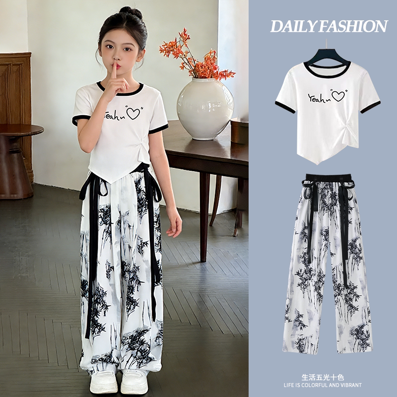 潮流国风裤 女童夏季 两件套 新款 夏装 14岁休闲T恤小女孩洋气套装由