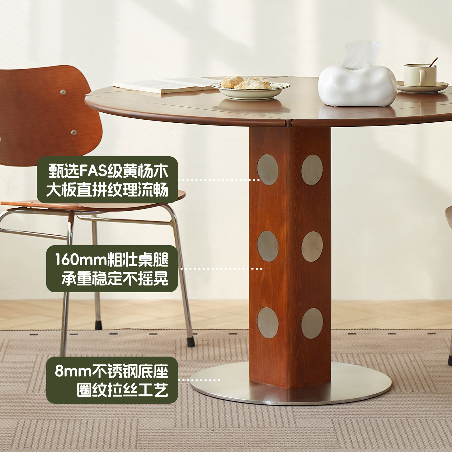 一栖一木洞石岩板实木伸缩餐桌圆形中古风家用小户型圆桌折叠饭桌