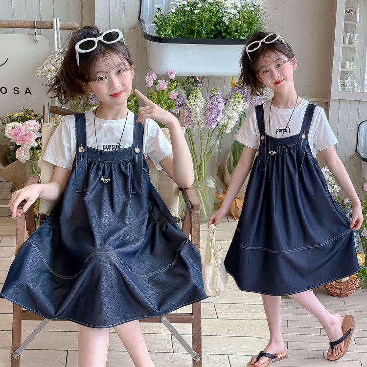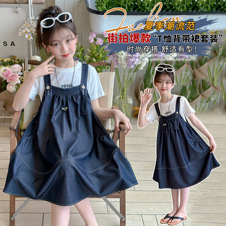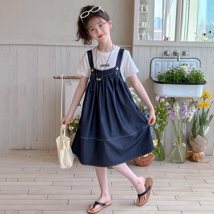 休闲韩版 洋气甜美天丝两件套中长裙透气薄 夏季 女童牛仔背带裙套装由