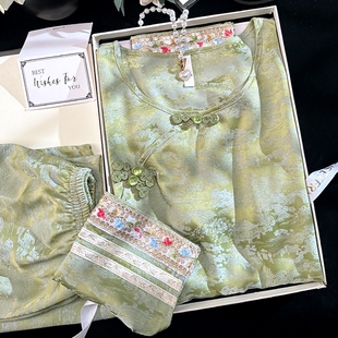 新中式 中式 家居服冰丝刺绣圆领汉服套装 国风睡衣女2025春秋新款