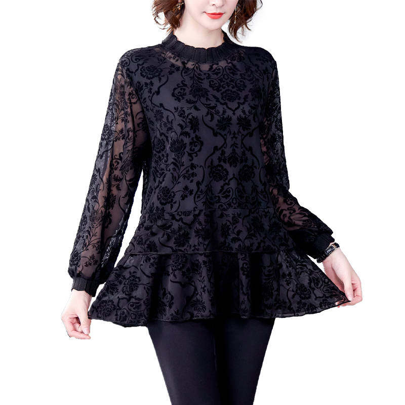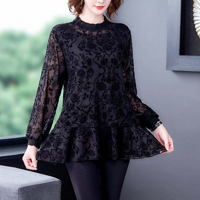 打底衫 新品 宽松小衫 女高档洋气大码 女蕾丝胖妈妈遮肚显瘦雪纺衫