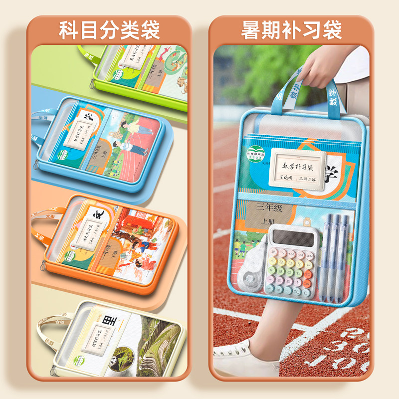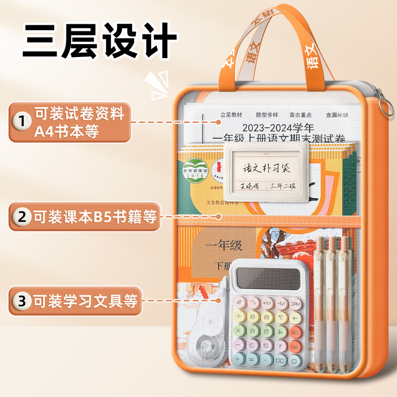 小学生初中生专用手提书袋高中生试卷资料书本作业袋子档案科目分类袋 双层大容量A4透明网纱文件收纳袋拉链式
