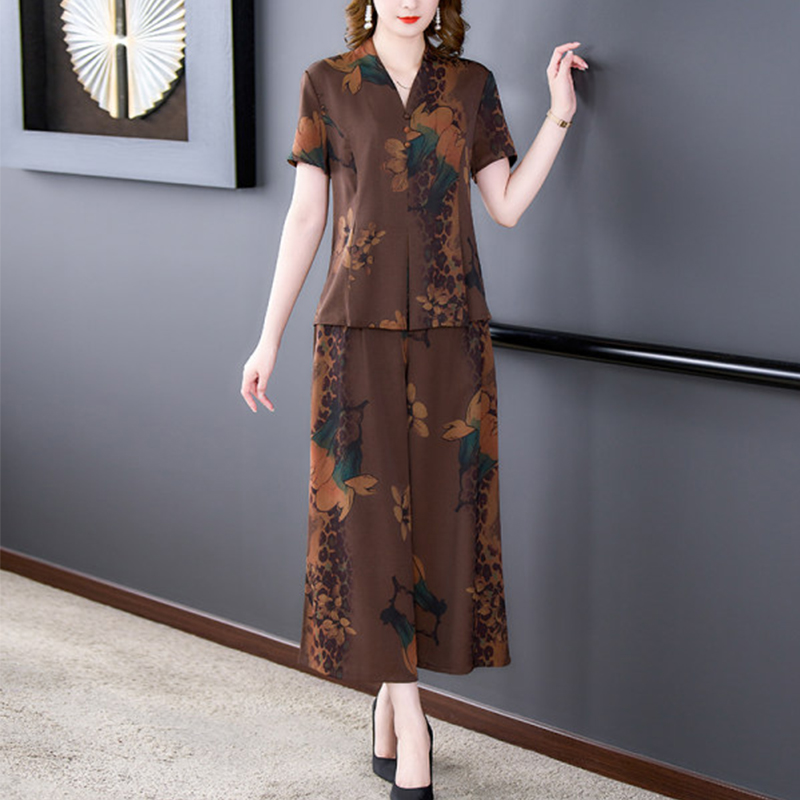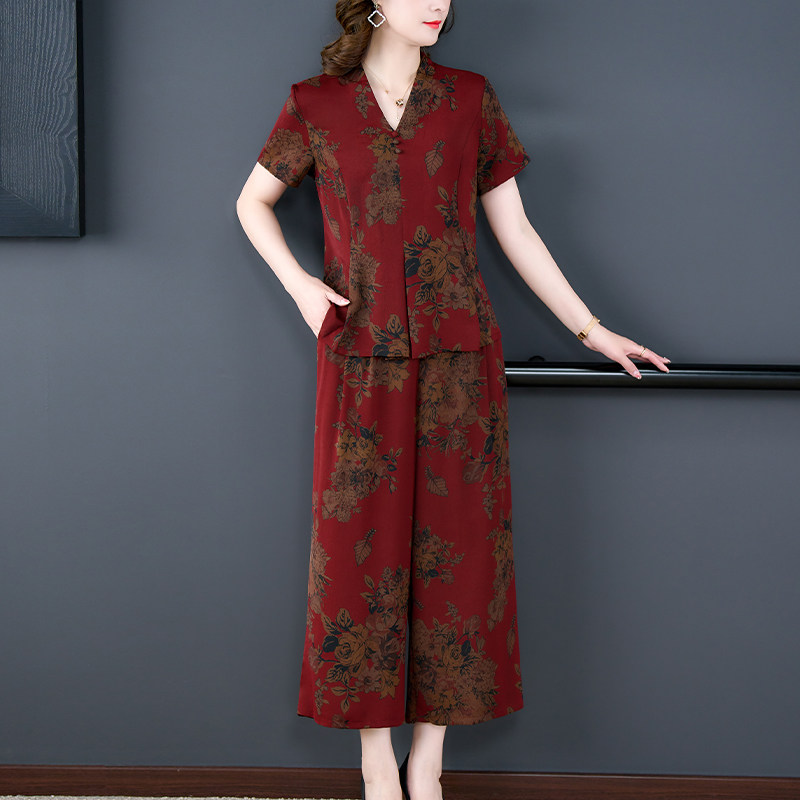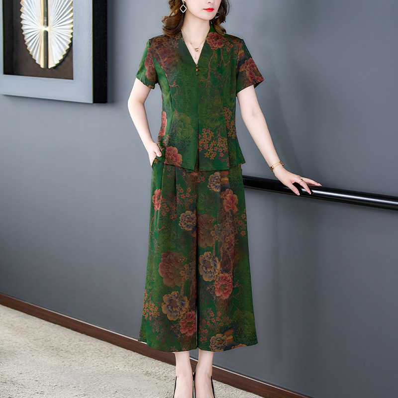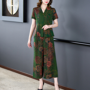高腰阔腿裤 夏季 两件套中年女士真丝香云纱套装 新款 高端时尚 妈妈装