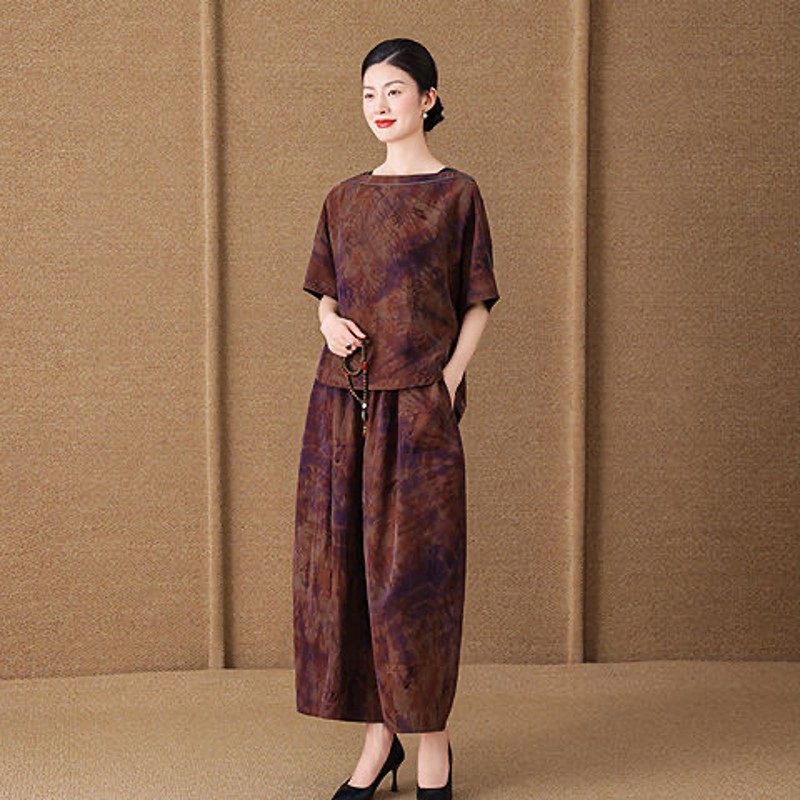 中年妈妈装 新中式 国风香云纱真丝套装 女夏季 两件套 宽松显瘦哈伦裤