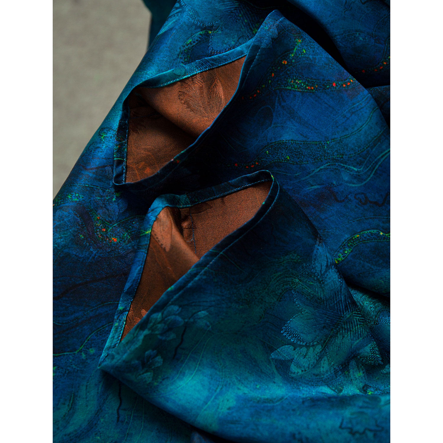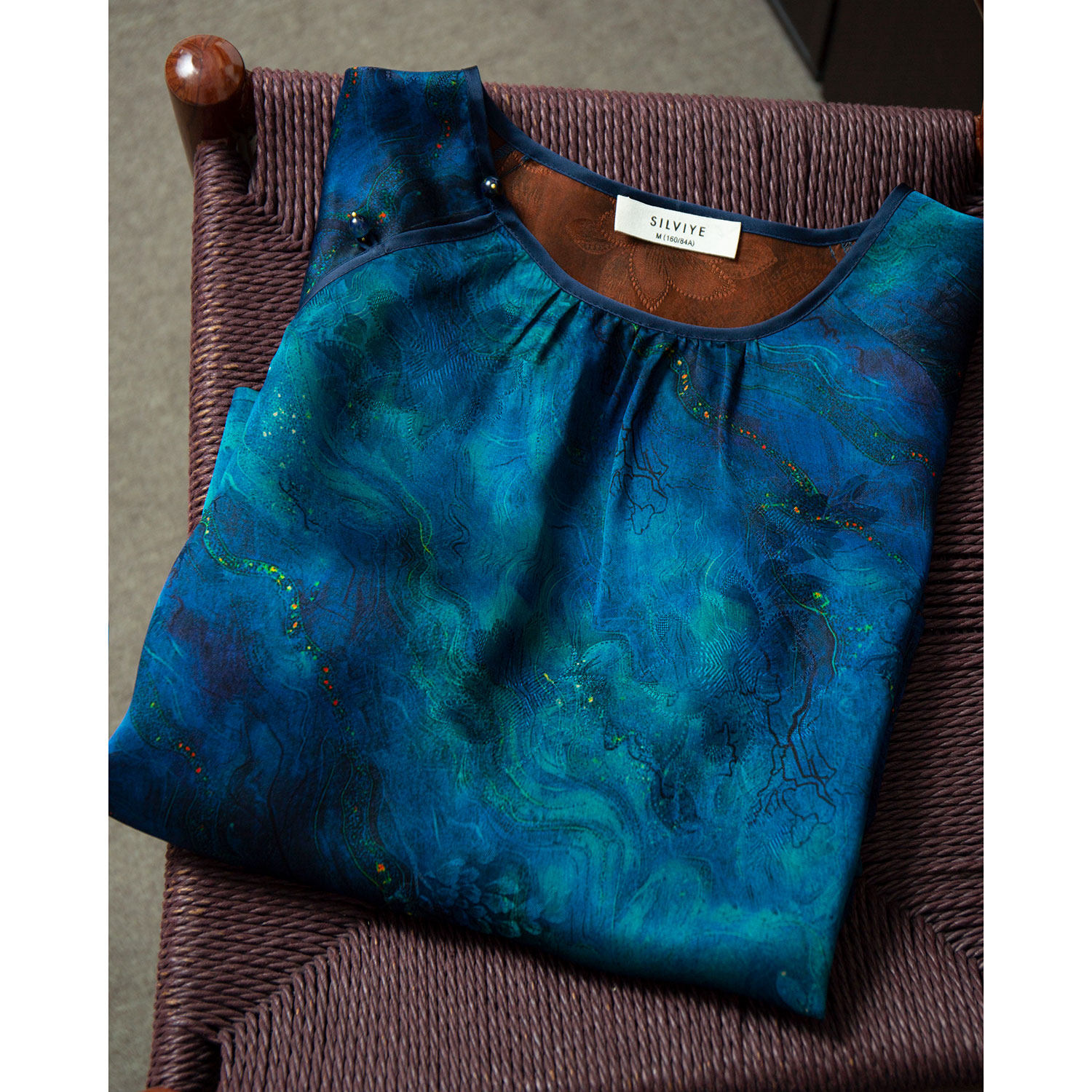 国风提花上衣 丝艺深海蓝真丝花罗香云纱100%桑蚕丝圆领宽松七分袖由