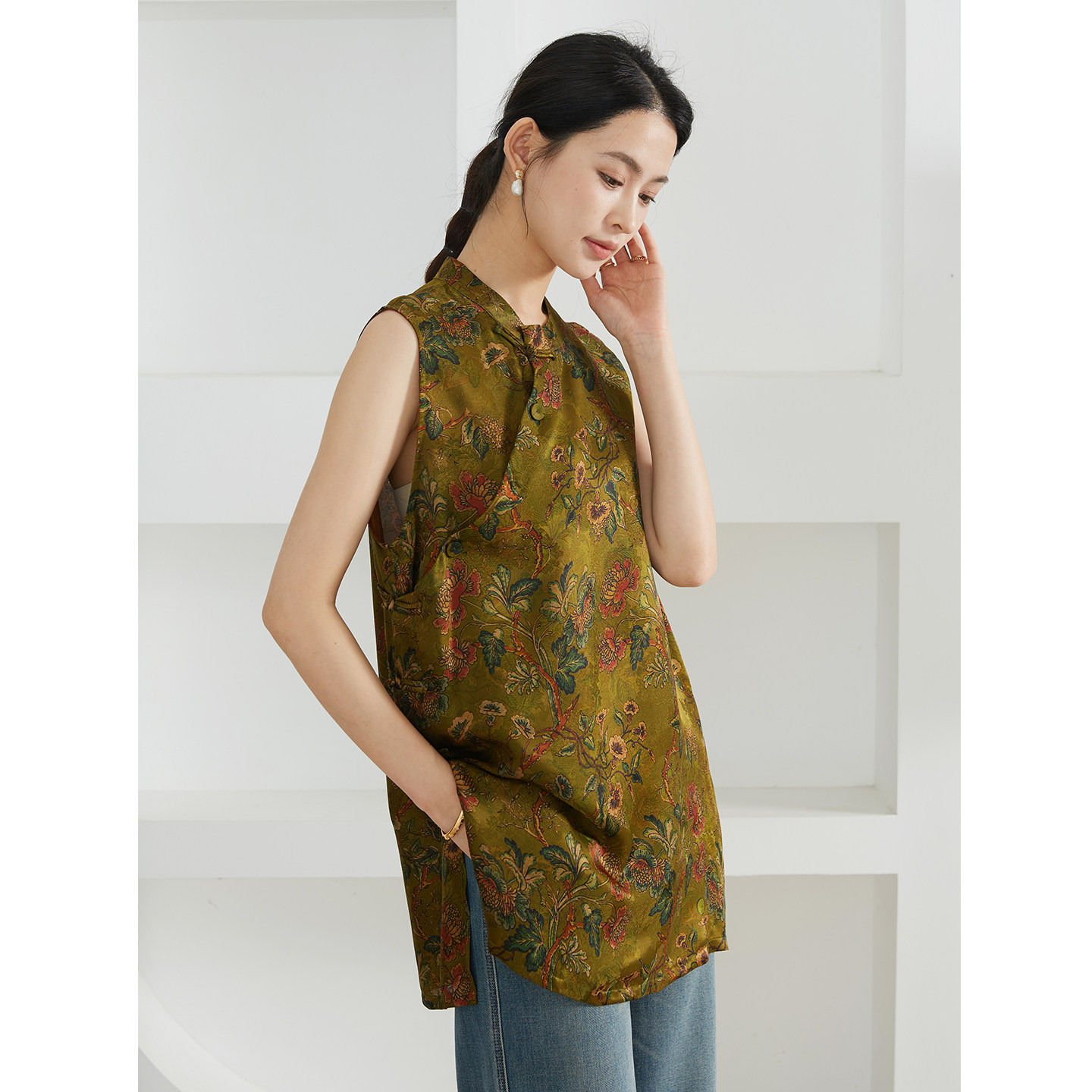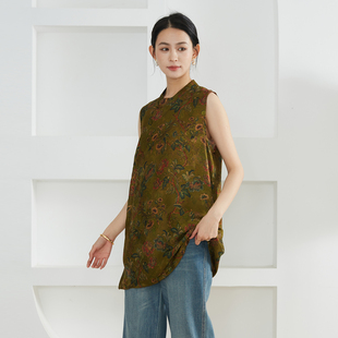 奥黛上衣 一丝牵100%桑蚕丝老钱风红云纱花萝女国风盘扣真丝中长款
