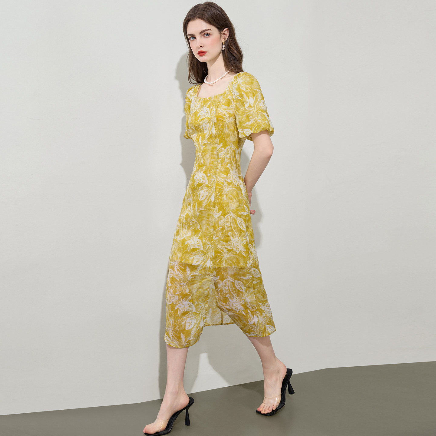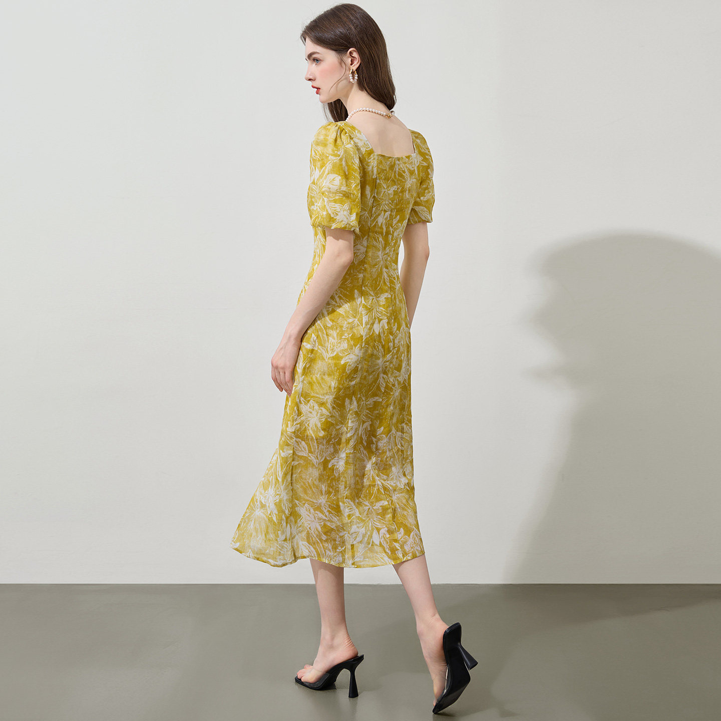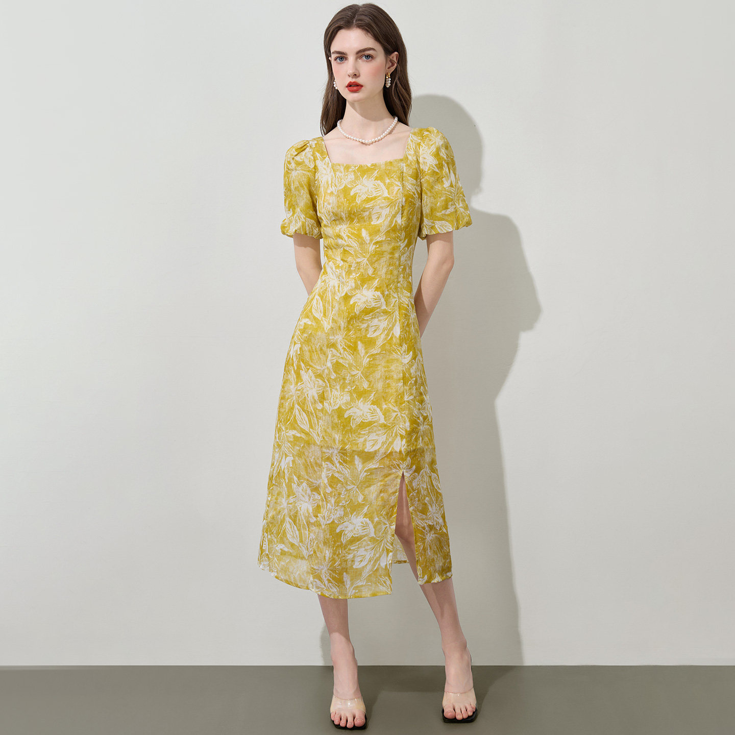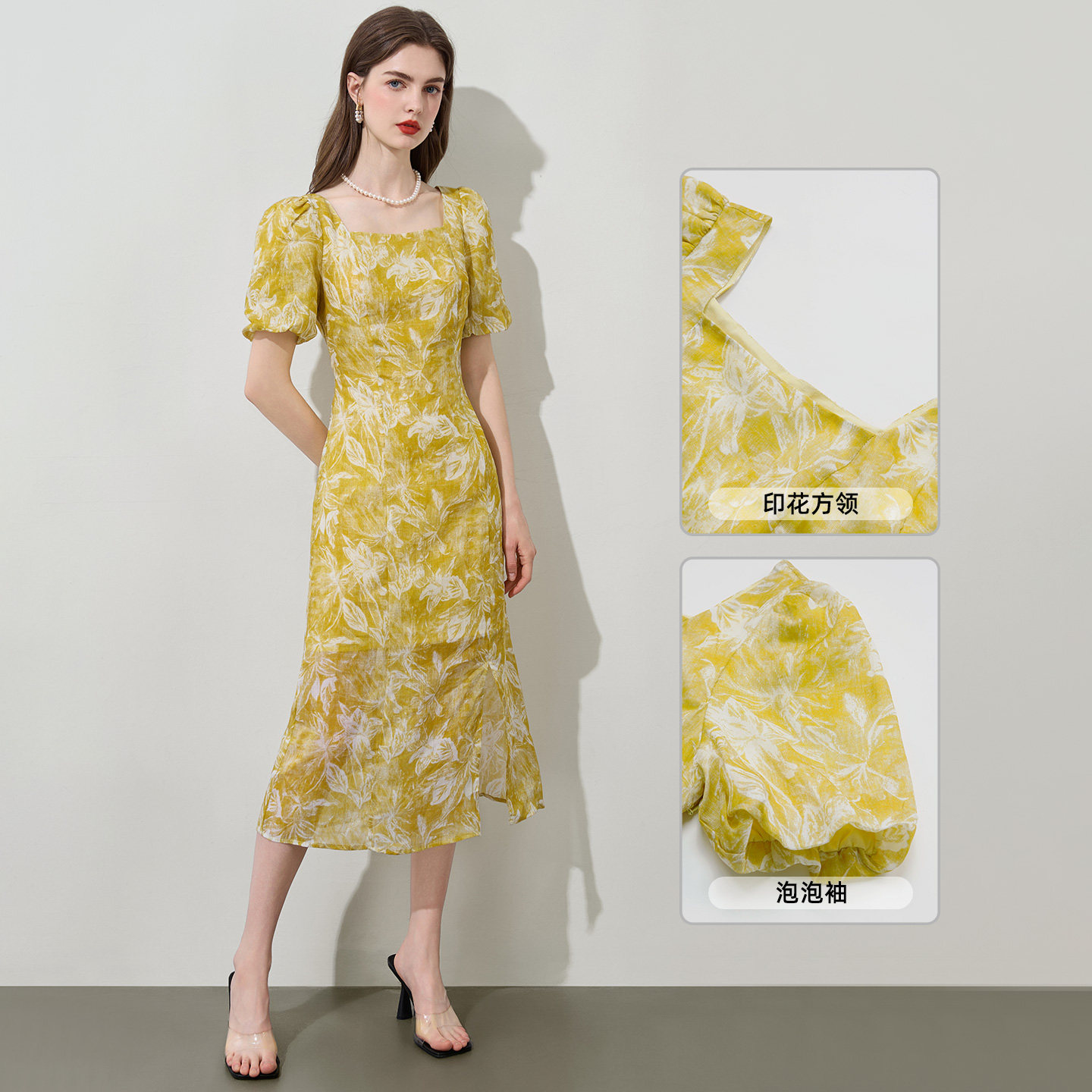 新款 中长款 亚麻碎花连衣裙女薄款 2026夏季 复古方领气质A字裙 法式由
