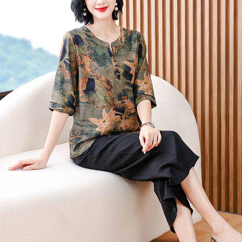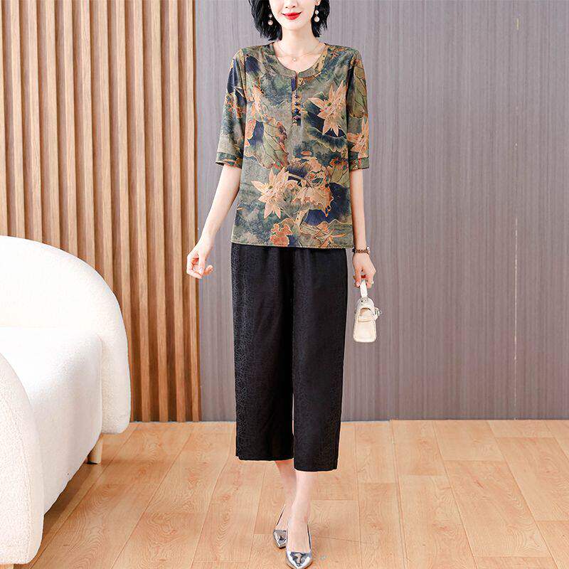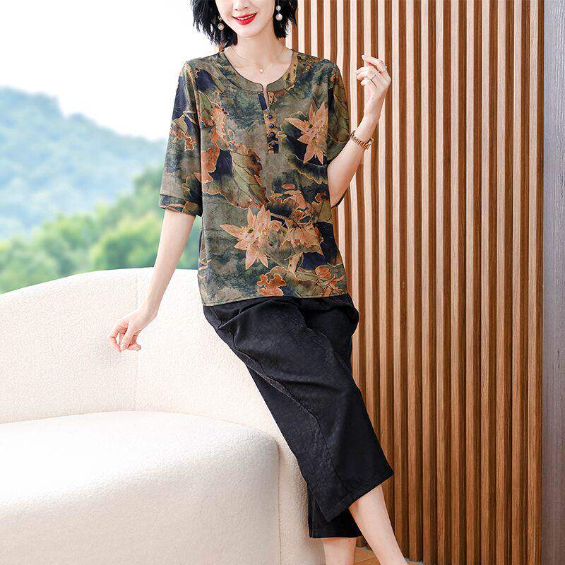 香云纱桑蚕丝套装 新款 中老年人上衣妈妈装 洋气宽松两件套 2026夏季