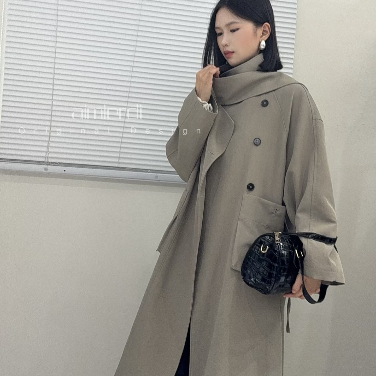 长风衣插肩袖 aimierdi欧版 高定法式 立领围脖式 气质 宽松腰带韩版