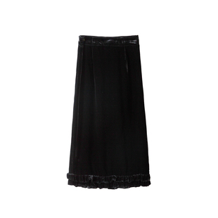 高定 a字裙半裙春 优雅木耳边真丝丝绒半身裙女小黑裙侧开叉新中式