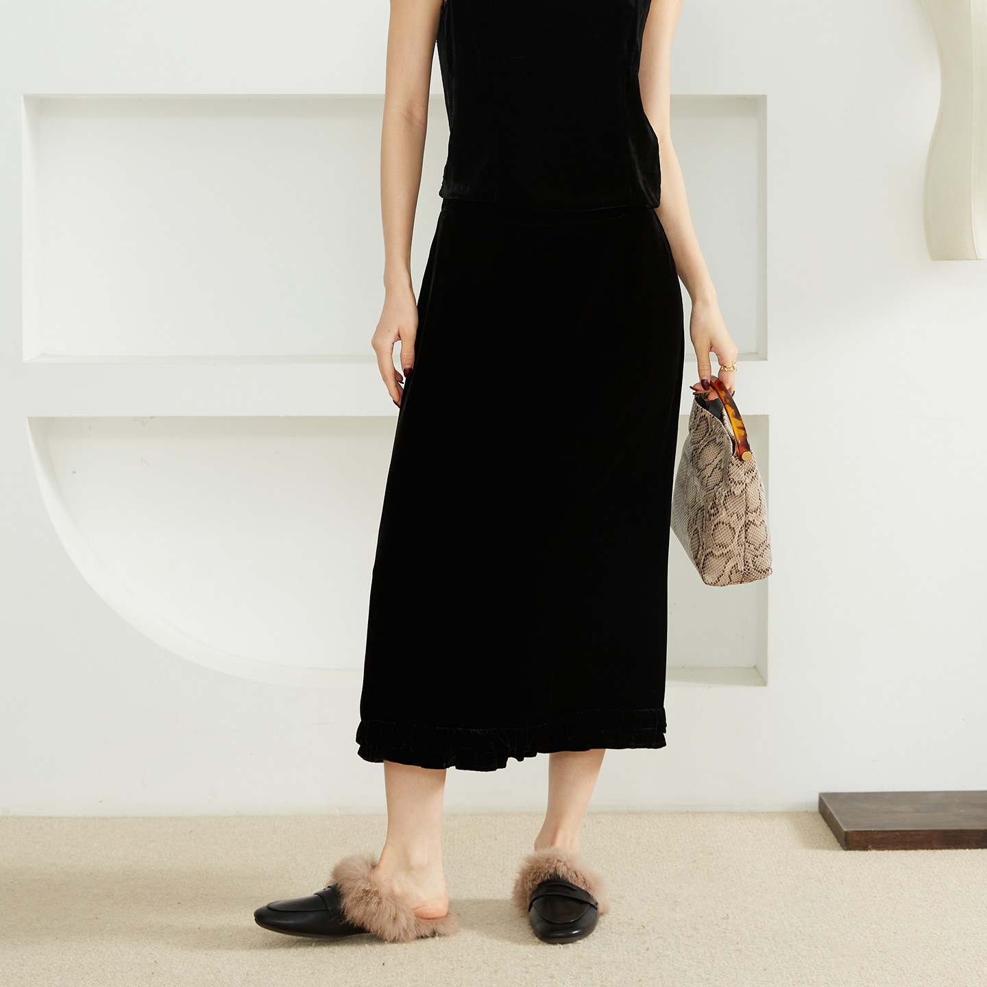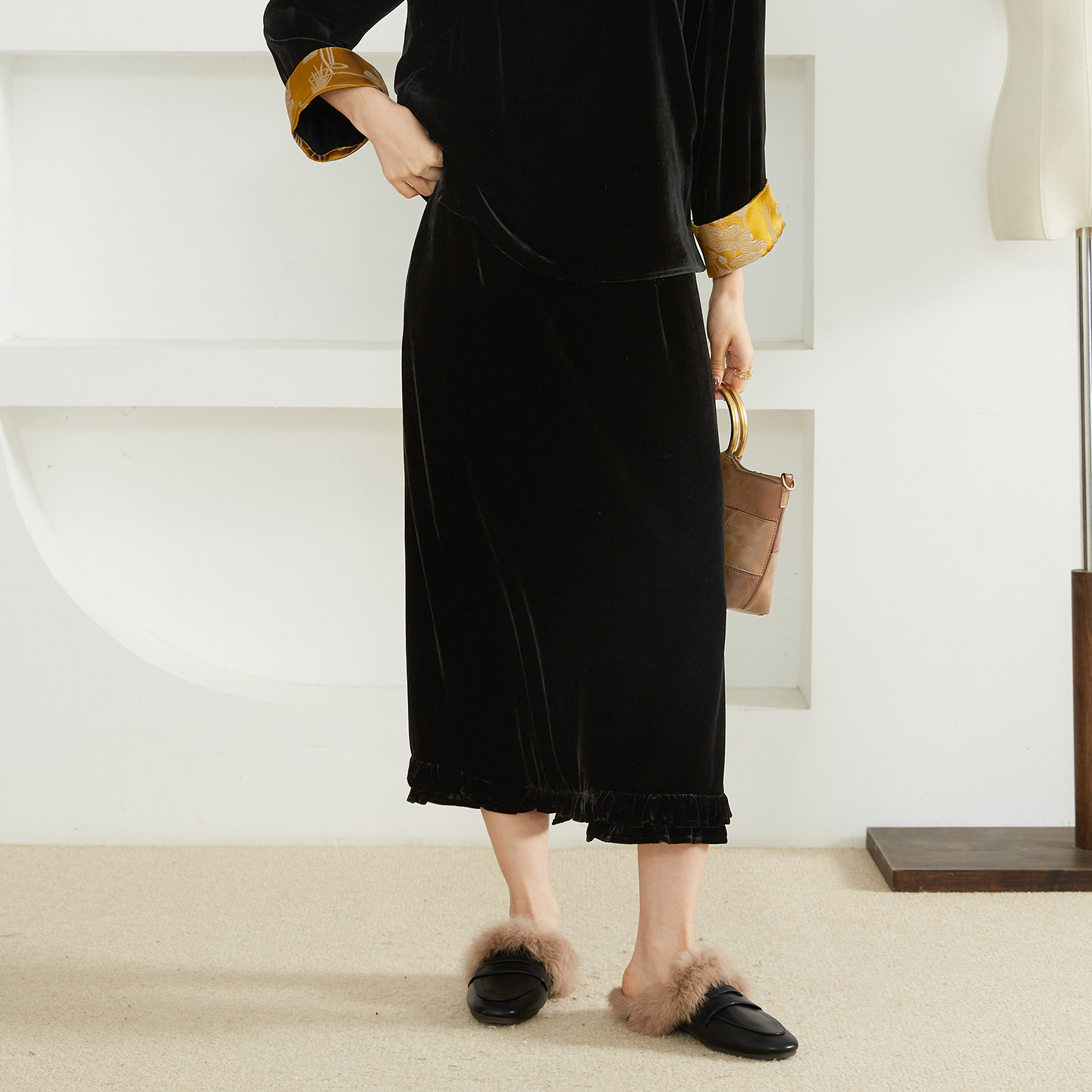 高定 a字裙半裙春 优雅木耳边真丝丝绒半身裙女小黑裙侧开叉新中式由