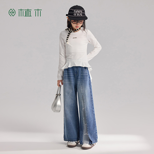 童装 植木 儿童2026春夏新款 女童直筒裤 蕾丝解构蓝 开叉牛仔裤由