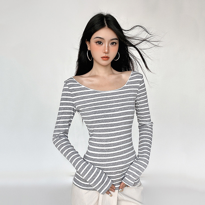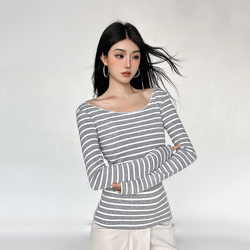 FUNOFF 罩衫 秋修身 圆领T恤上衣女 复古灰色miu系条纹斜肩轻薄长袖由