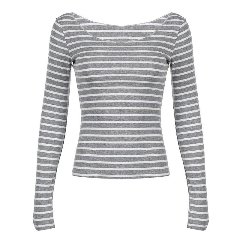 FUNOFF 罩衫 秋修身 圆领T恤上衣女 复古灰色miu系条纹斜肩轻薄长袖