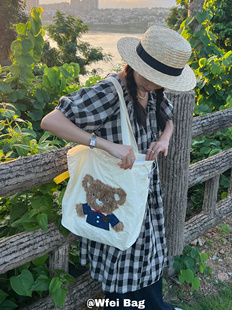 Wfei小熊抽绳尼龙包帆布包小众托特包女通勤奶黄单肩包大容量布袋由