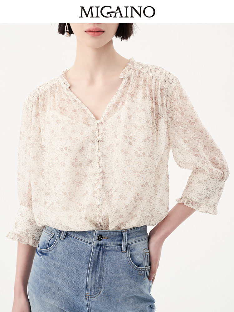 女2023早春新款 气质V领碎花上衣MN32AC005 衬衫 Migaino曼娅奴法式由