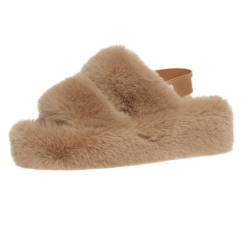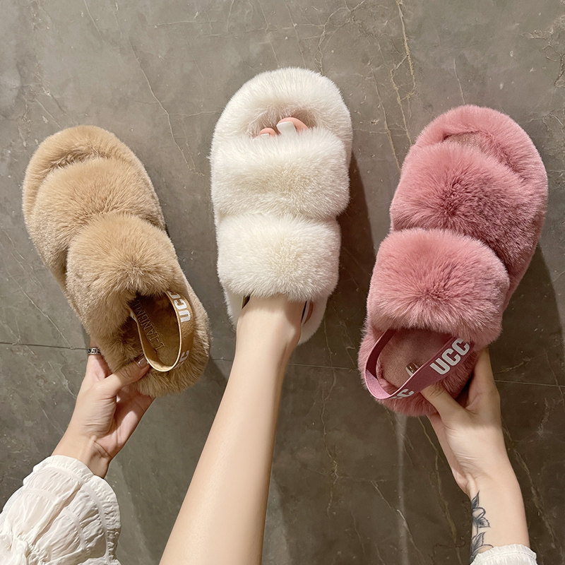 2026新款 女外穿时尚 ins潮冬季 厚底室内毛绒棉拖 网红双带毛毛拖鞋