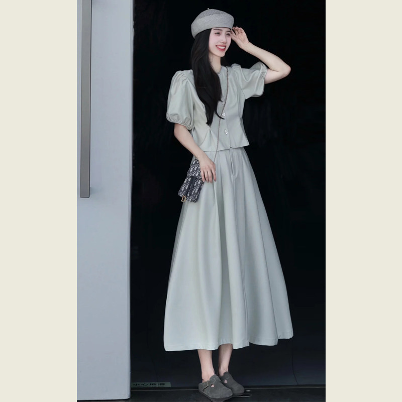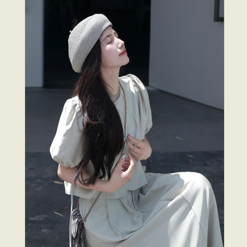 圆领泡泡袖 韩系时尚 减龄洋气套装 女夏季 上衣高腰半身裙两件套 短款由